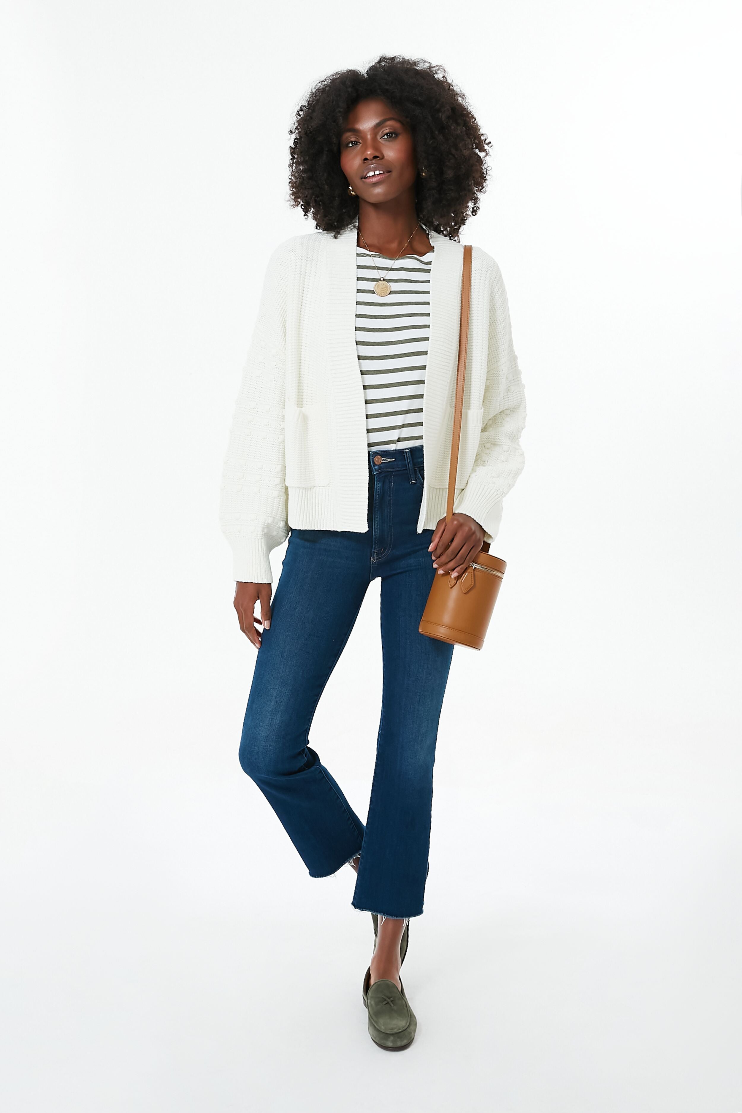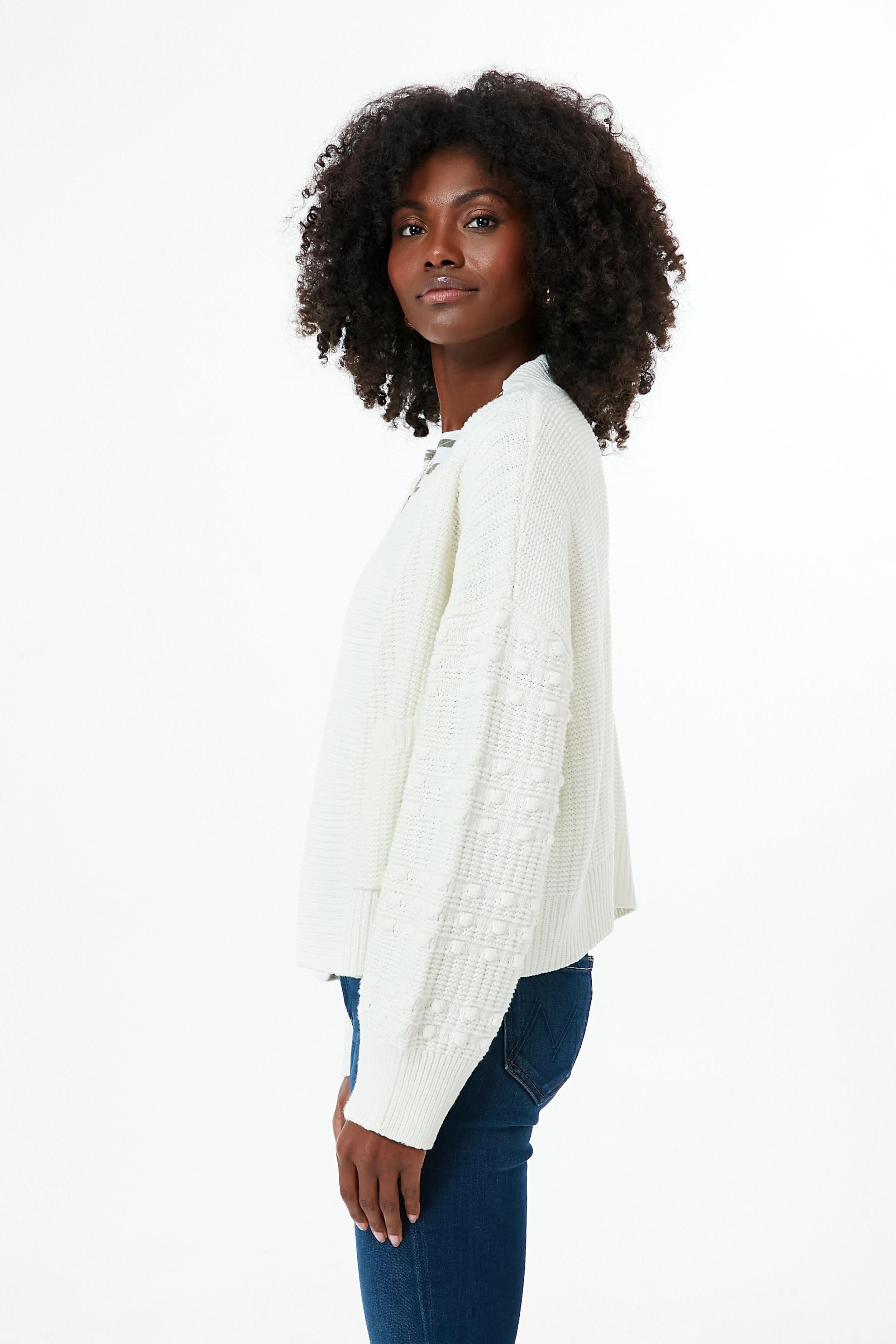 A good cardigan is all you need to give your outfit the extra boost that its missing. queue the Cream Bobble Cardigan. This stunner features a classic silhouette that's not too long but not cropped either. and in a neutral colorway that goes with any and everything. you'll constantly reach for this piece. Updated with blouson sleeves and fun pom accents. pair with flats and your go-to denim for a sophisticated city-chic look.