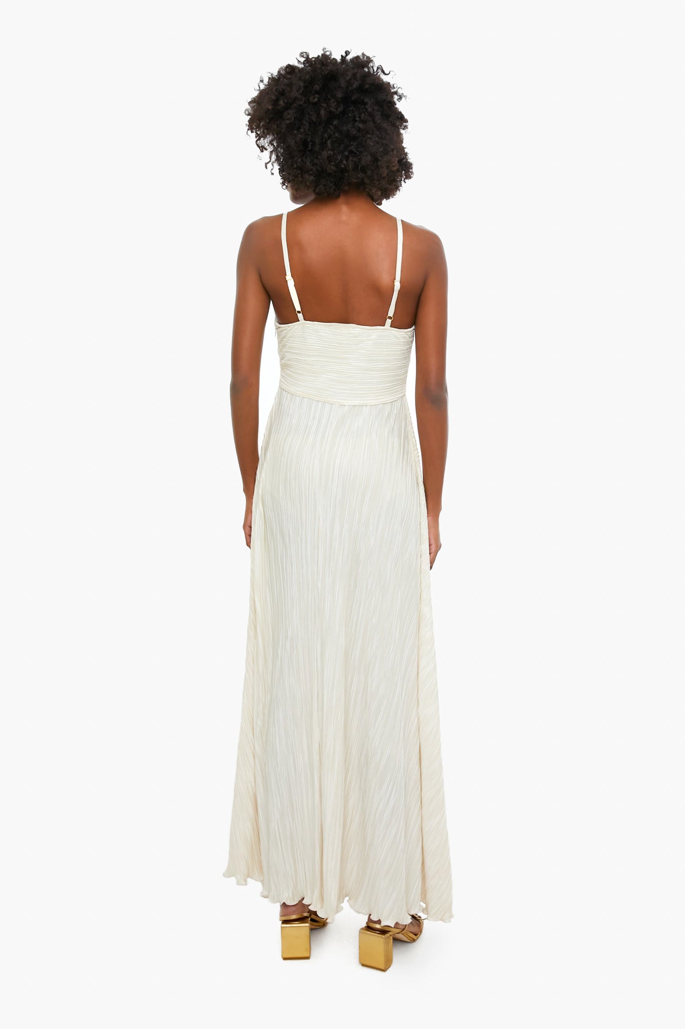 The Cataleya Dress is made from a new engineered fabric with pleats and waved edges. This vintage-inspired slip dress has dreamy texture and fit from its adjustable spaghetti straps and gathered bust to its fixed waist and flowing full-length skirt. Perfect for the beachfront bride or a tropical getaway. we are pairing this style with gold heels and jewelry for a modern look.