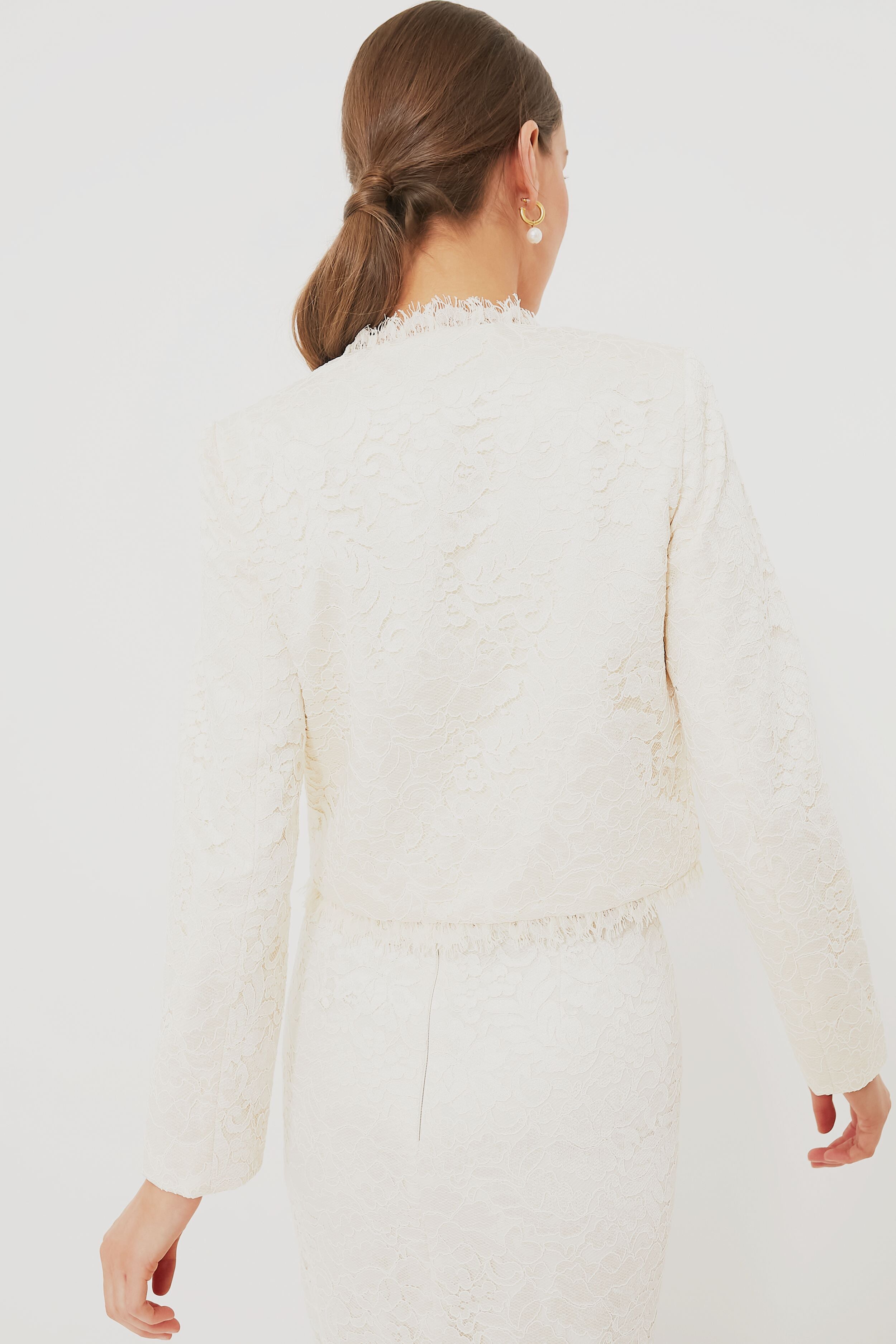 Bringing a retro-romantic feel. the Cream Cord Lace Jacket is an effortless shortcut to a polished outfit. Featuring jeweled buttons and lace trim. its relaxed fit allows it to be dressed up or down. Pair with denim and flats or the Cream Cord Lace Midi Skirt for a sophisticated matching set!