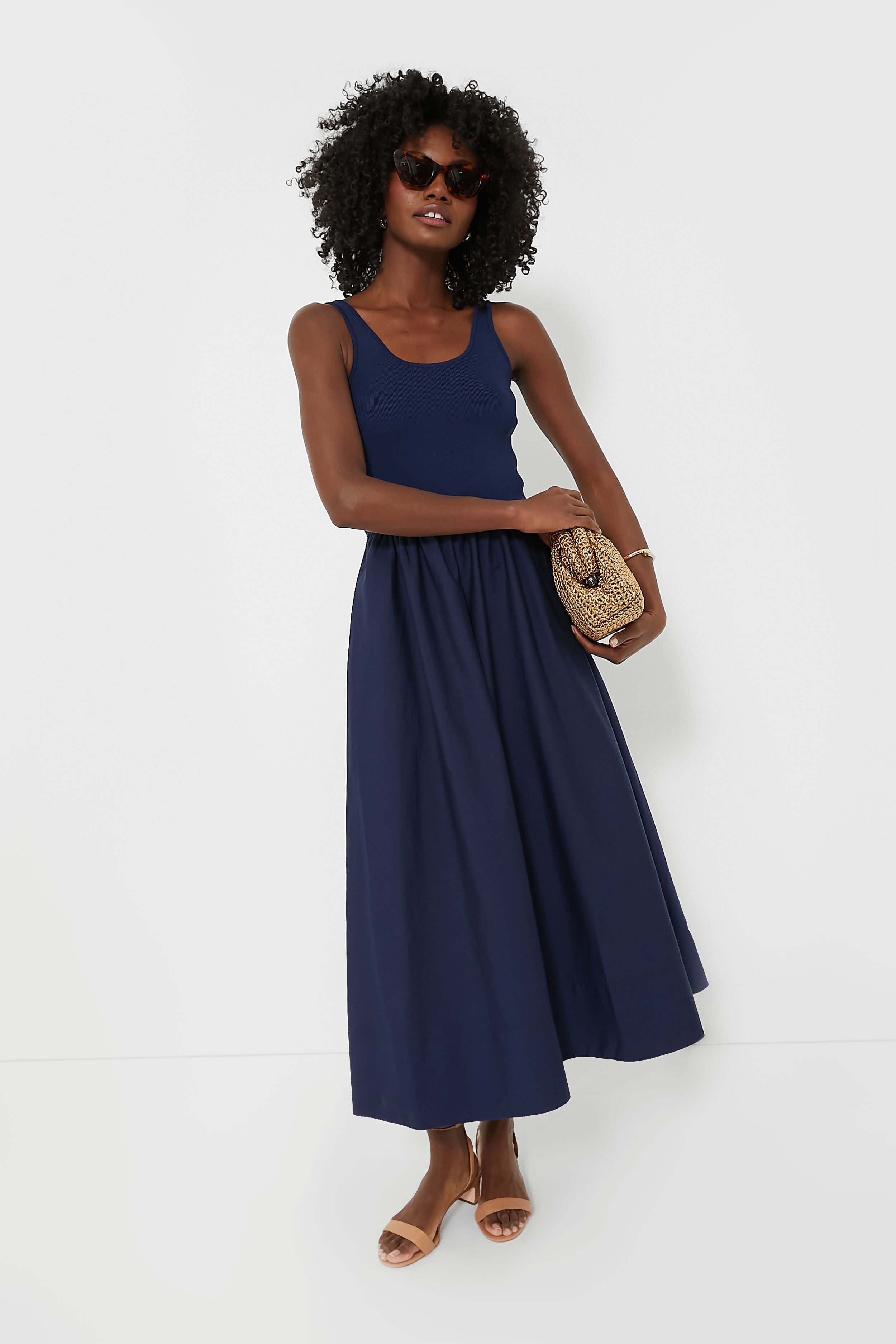 Easy breezy. the Cruise Navy Zaha Day Dress is perfect for summer. Designed for a figure-flattering silhouette. this elegant sleeveless tonal midi merges a slim rib-knit bodice with a sweeping woven skirt that gently sways as you move. Add sandals and some statement jewelry for an effortlessly chic look perfect for anything from luncheons to happy hour.
