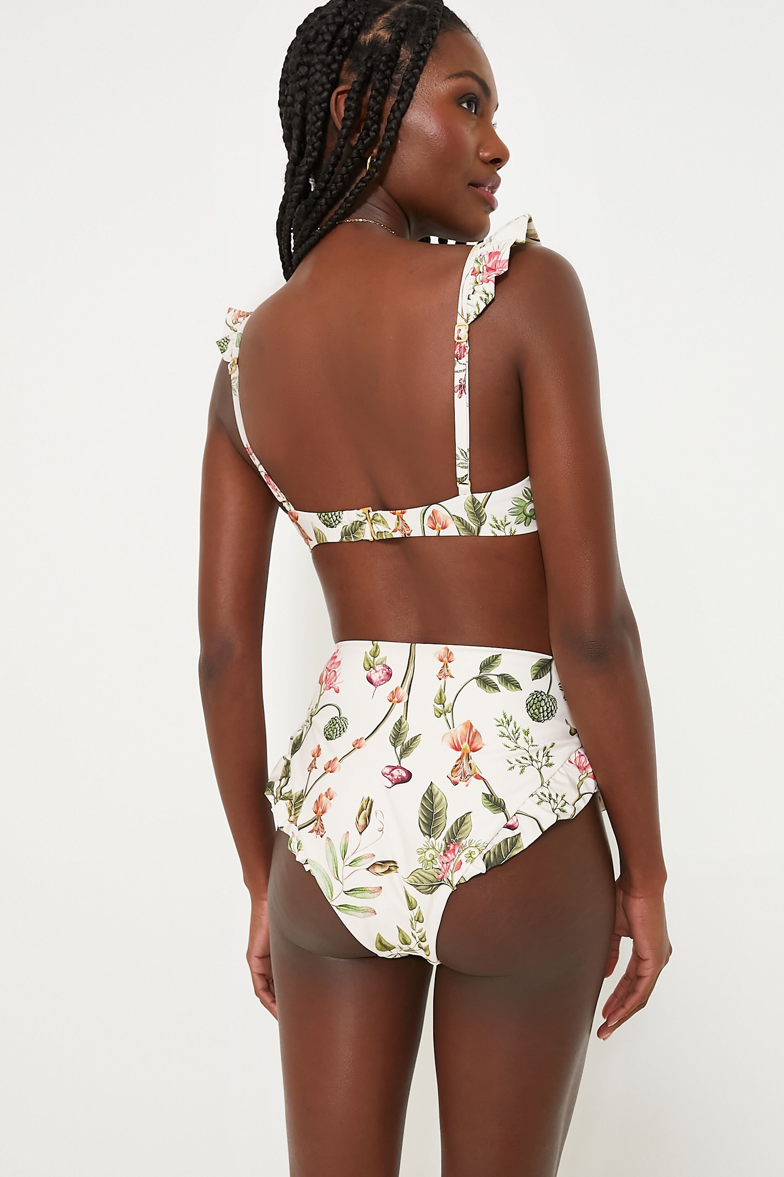 The Cultivo Kiwi Bikini Top is crafted from recycled stretch fabric. detailed with adjustable ruffled shoulder straps. a sweetheart neckline. underwire cups. and a hook fastening at back. Printed with a motif inspired by Colombia's native floral and fauna. these are sure to make a splash at the beach or pool. Add the matching bottoms and pareo for a day of fun under the sun!
