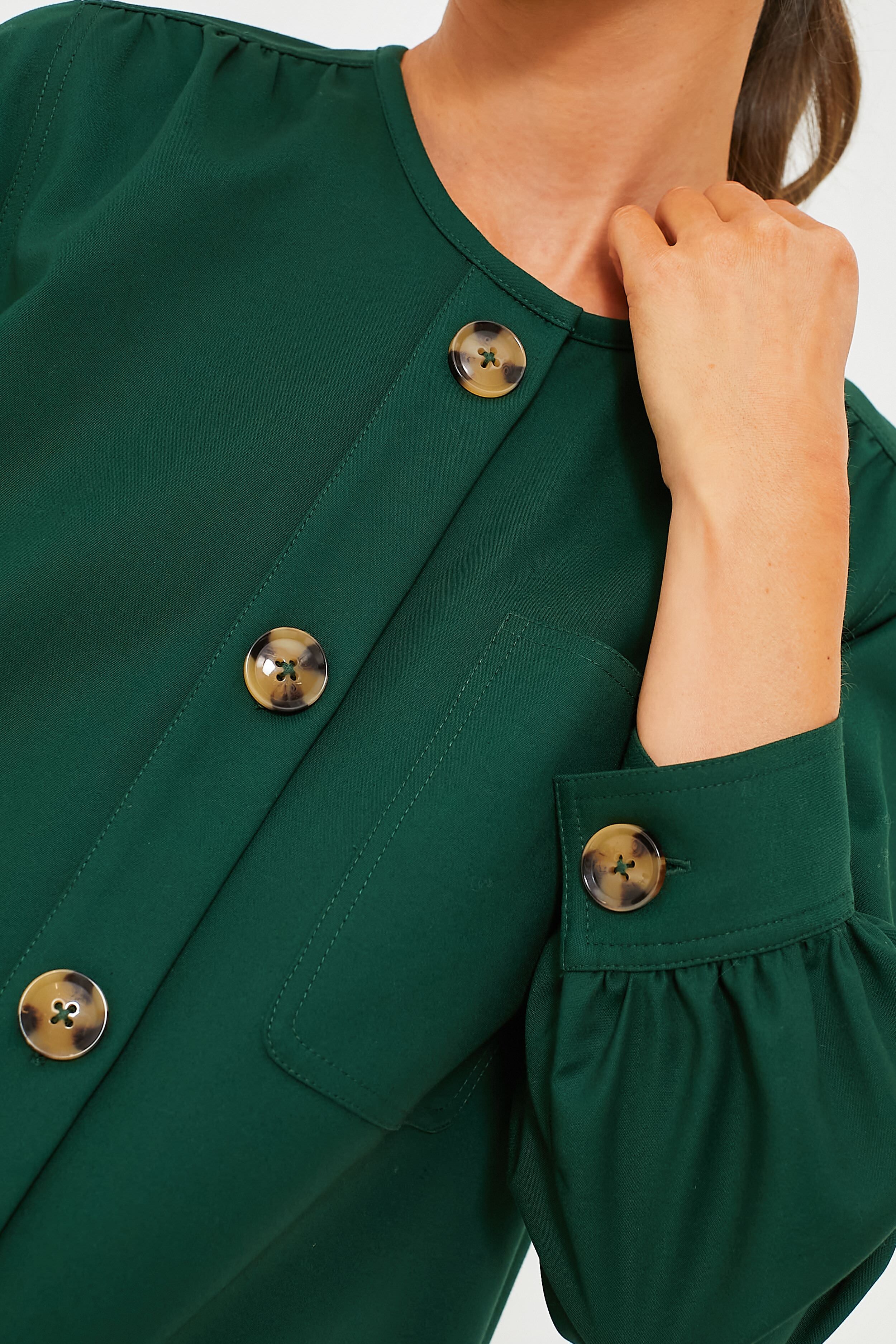 Featuring a full front placket with tortoise shell buttons. long puff sleeves. and a boxy silhouette. the Dark Green Blake Dress is the perfect mod-inspired style. With pockets along the side seams and left chest for extra fun and function. this edgy mini is casual cool while still exuding chic sophistication. Perfect for year round wear. pair this desk to drinks number with heeled sandals for warm days ahead and swap for loafers or boots as the temperature drops.