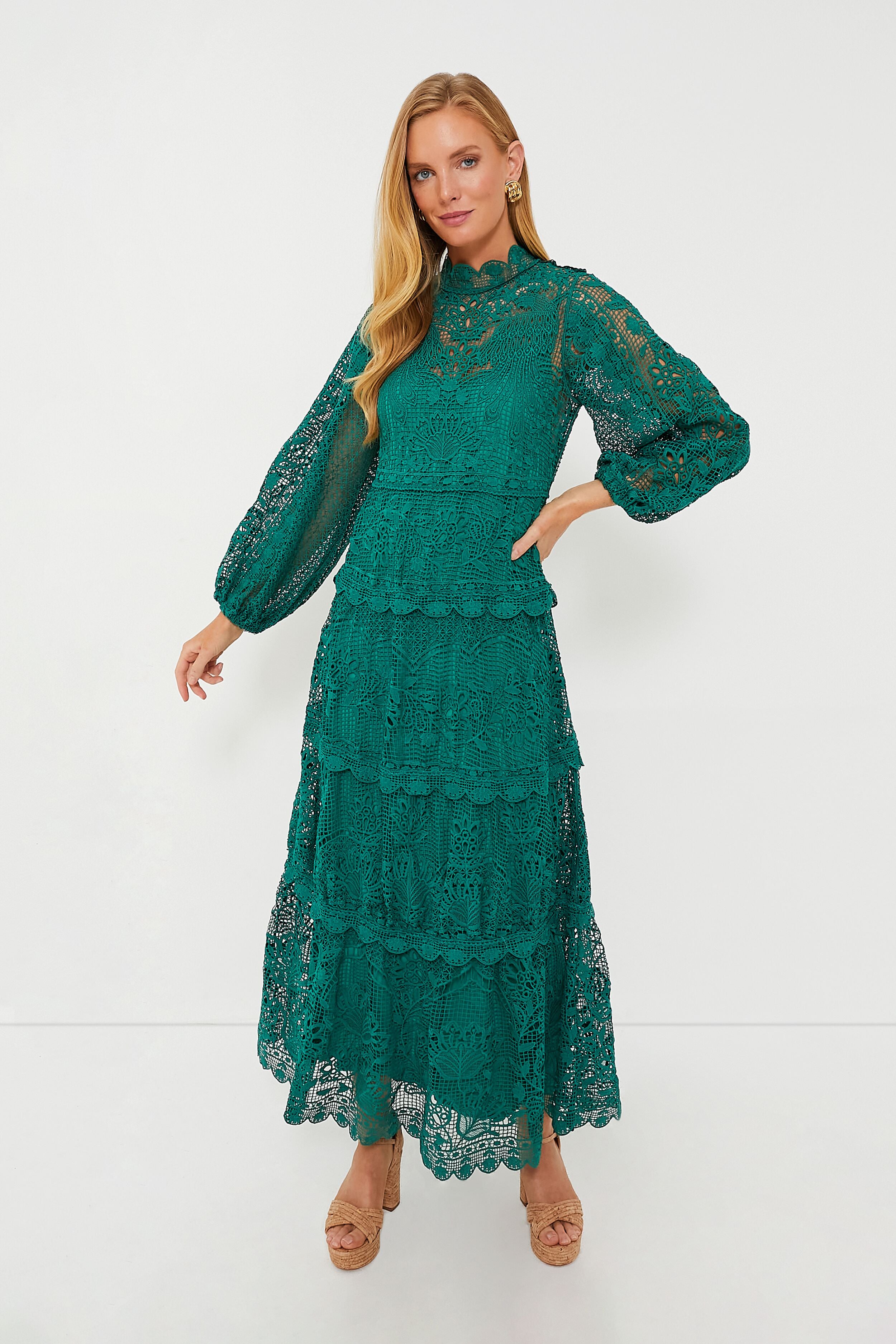 Once you fall for the Dark Green Long Sleeve Dress. you'll always be in love! Cut from guipure lace that's beautifully patterned with delicate flowers and scalloped along the edges. this maxi features blouson sleeves. a flowing tiered skirt and a tonal slip providing the perfect amount of coverage. Turn all moments into memorable occasions. from wedding celebrations to happy hours at the beach. just add heels or sandals for a jaw-dropping look.