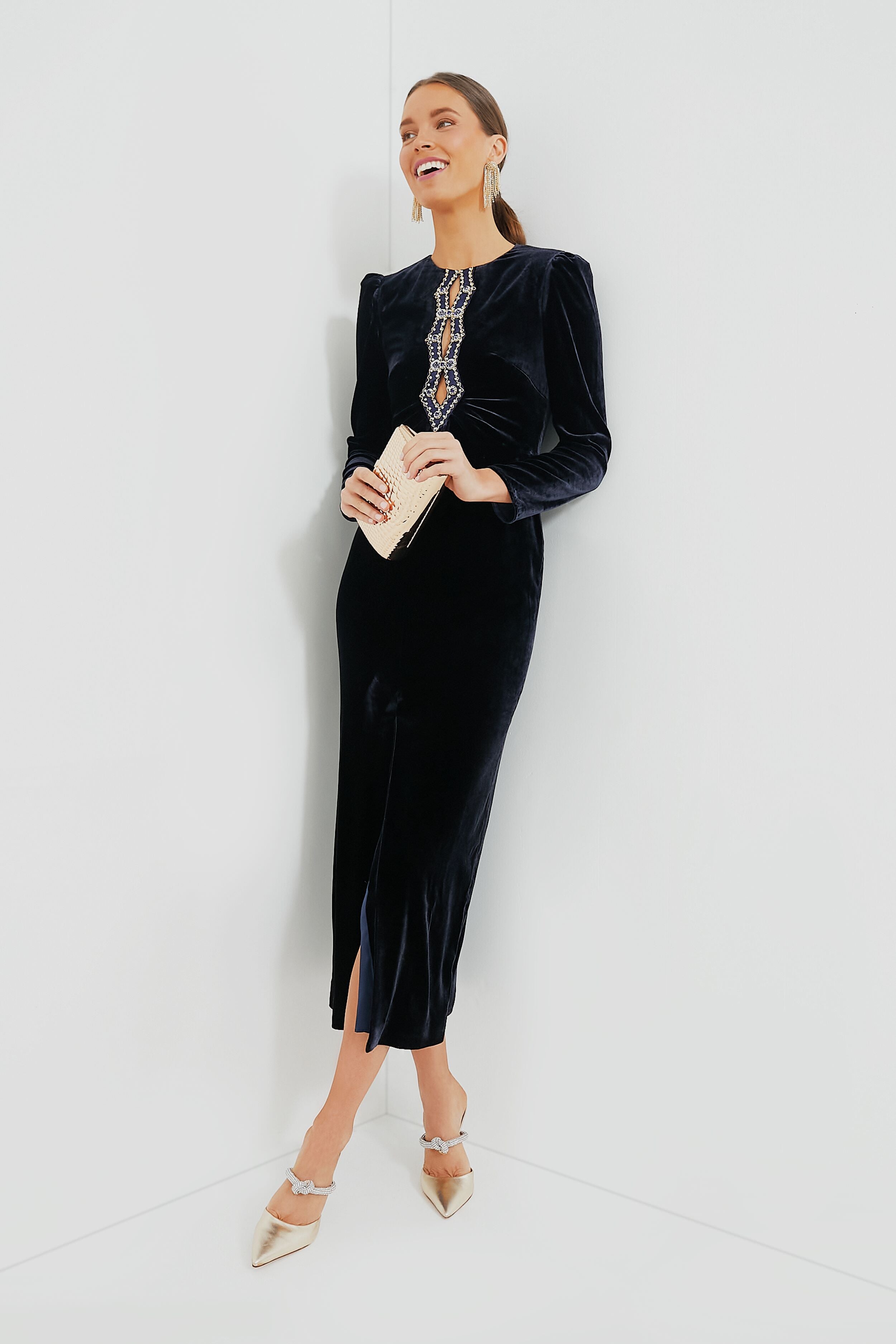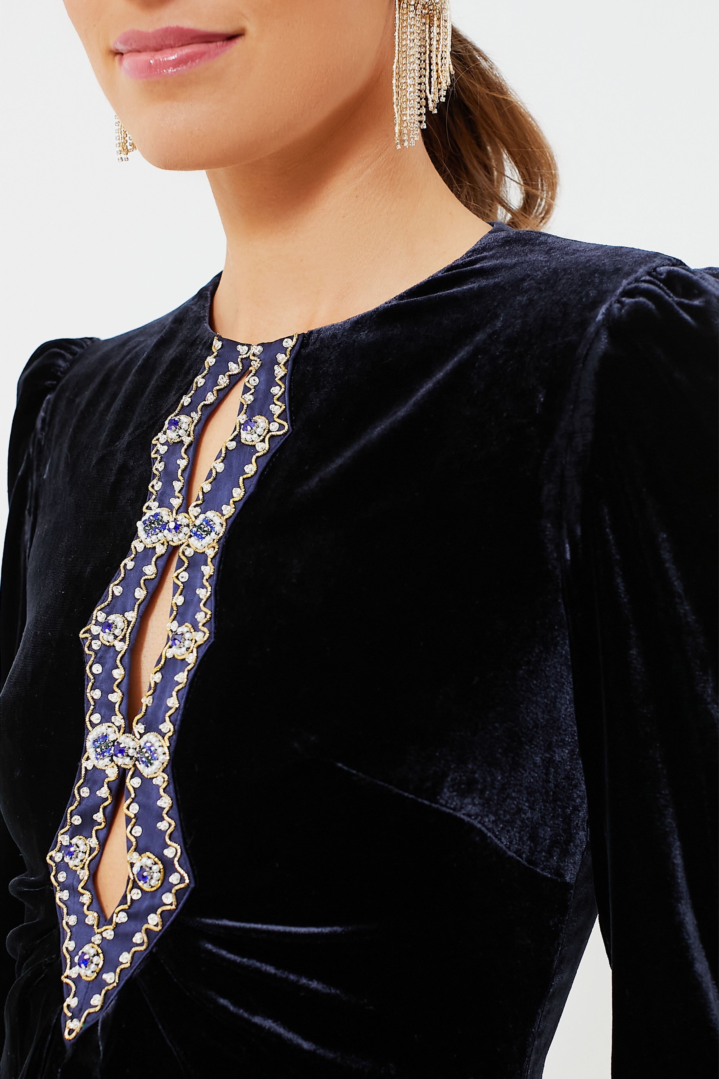 The Dark Navy Sapphire Jinx C Dress is an elegant look for parties and events. A flattering silhouette in rich sapphire velvet is decorated with eye-catching and intricate keyhole threadwork detailing. The front slit and midi length allow your shoes to shine. pair with simple black heels or silver flats!