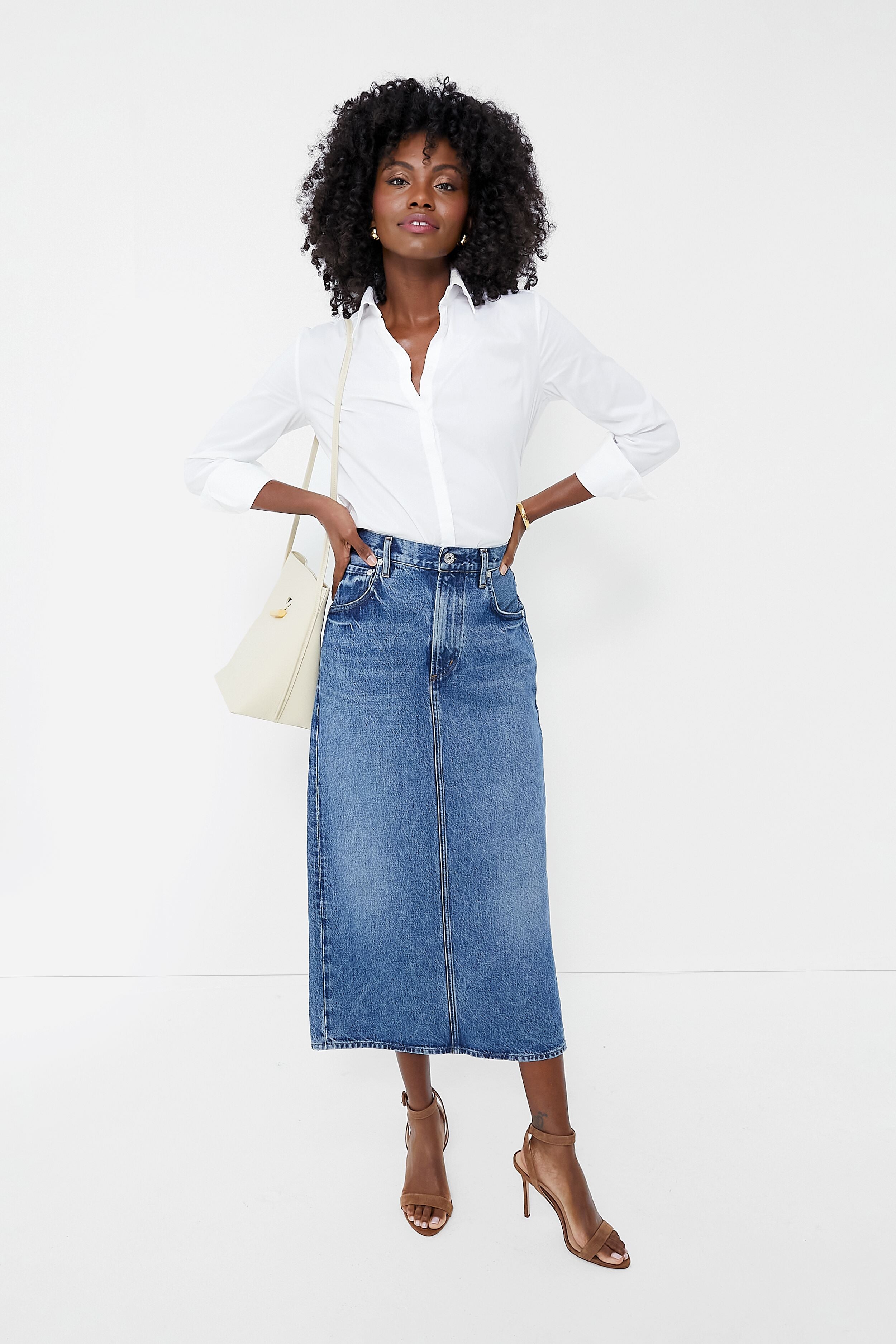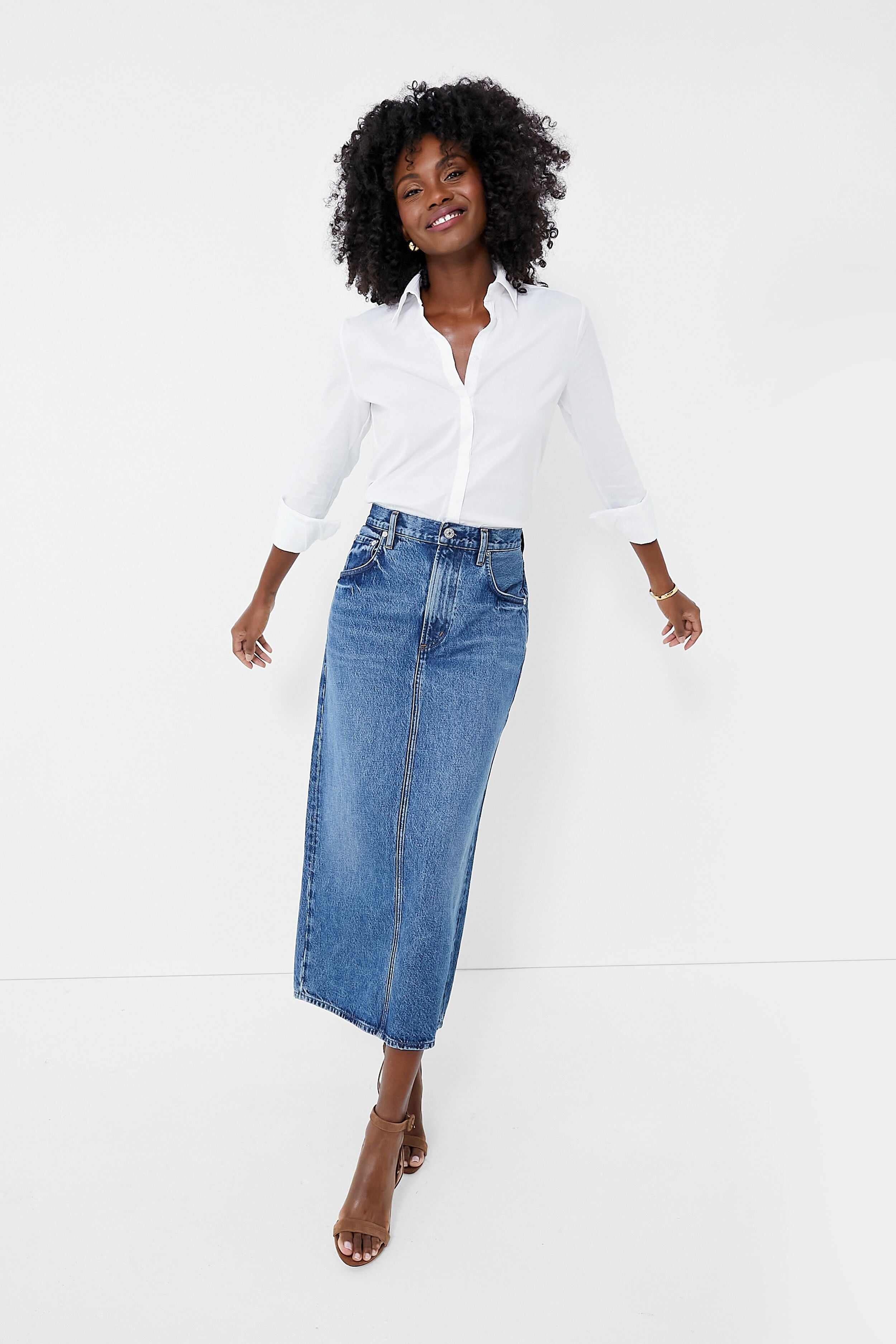 Denim midis are back in a big way. and our pick is the Daru Peri Pencil Skirt. In a medium indigo wash that is totally timeless. this high-rise silhouette features a zip fly. subtle whiskering for that well-loved vintage feel. and a back slit for easy movement. Pair with tanks. tees. button downs. and sweaters — this stunner is about to become your go-to!