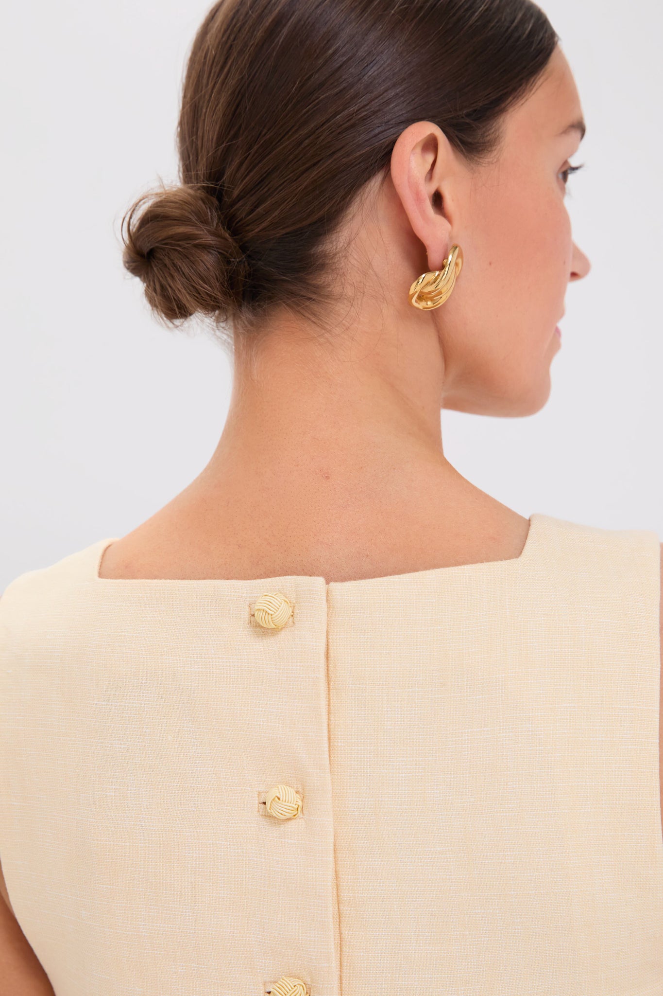 Tailored in mid-weight linen. the Rio Mini Dress features an elegant. high square neckline and fitted silhouette. Self-covered buttons extend down the centre front. while the back turns to reveal a cinch strap to tailor the fit. Style this elegant mini with the coordinating Dusty Citron Rio Shift Jacket. a fun ballet flat. and handbag for a timeless look!