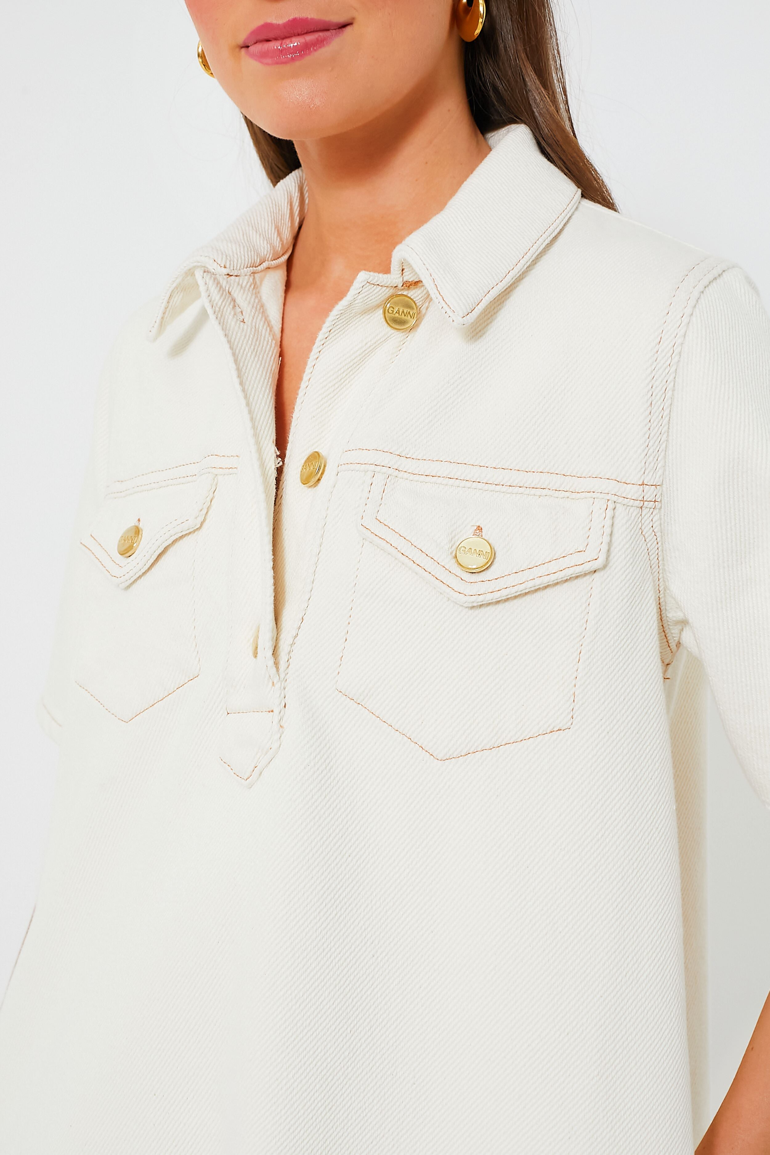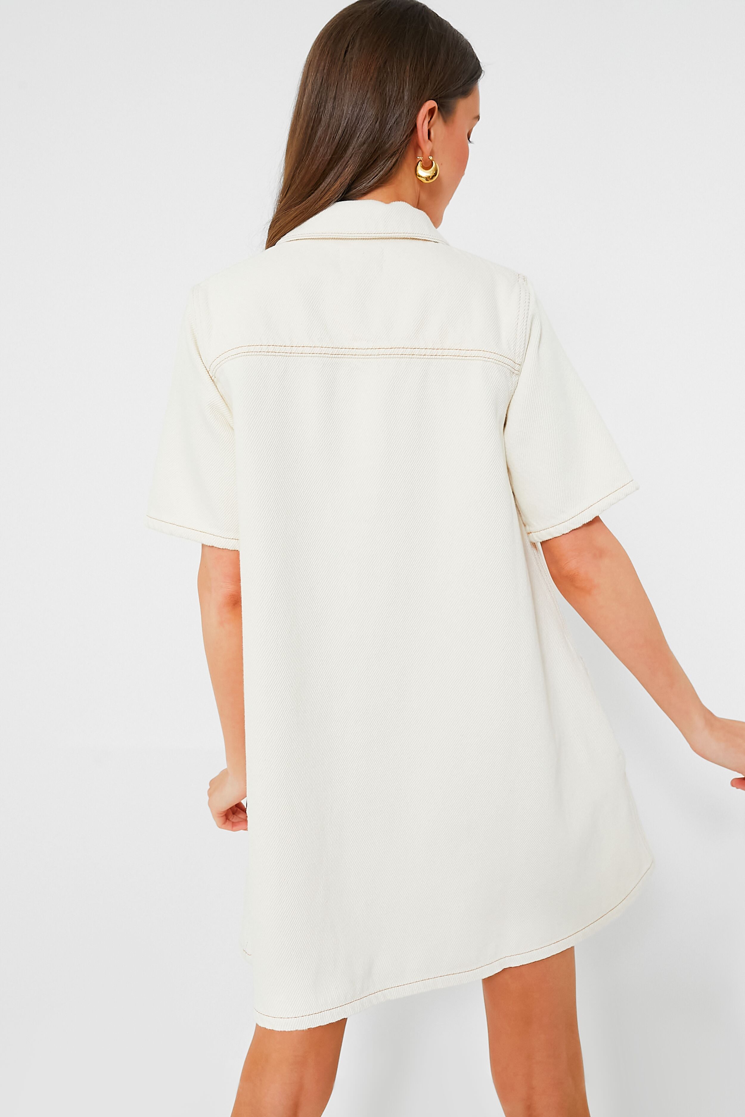 Elevate your capsule wardrobe with the Egret Heavy Denim Mini Dress. This mini is constructed from a structured organic cotton. featuring a front button placket. front chest flap pockets. and a collared neckline. Exquisitely chic. we are pairing this look with everything from sneakers to sandals.