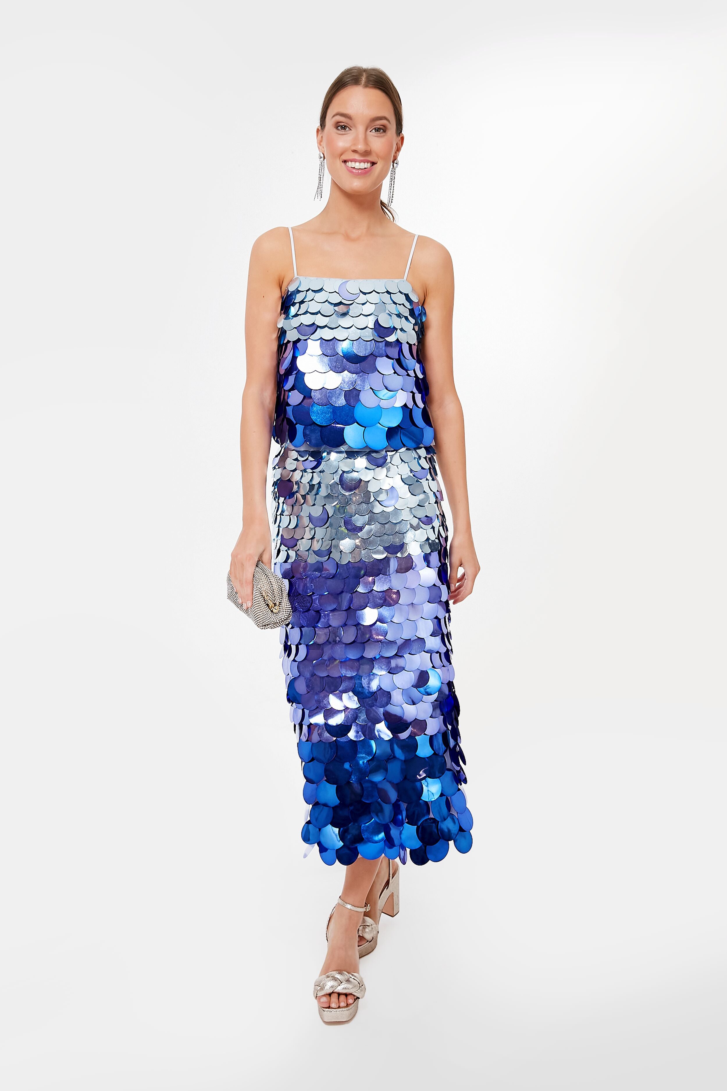 Bring on the mystique with the Elvira Ombre Circle Skirt. With a wearable. pencil silhouette that drapes beautifully. this style is adorned with glimmering circular sequin paillettes that catch the light as you twirl around. A mesh lining ensures there is just enough stretch for a fit that will remain comfortable from the time you're getting ready for the evening until the lights come on at the end of the night and the dancefloor clears out. Pair with the matching top for a fun look that is sure to catch some eyes and some compliments.