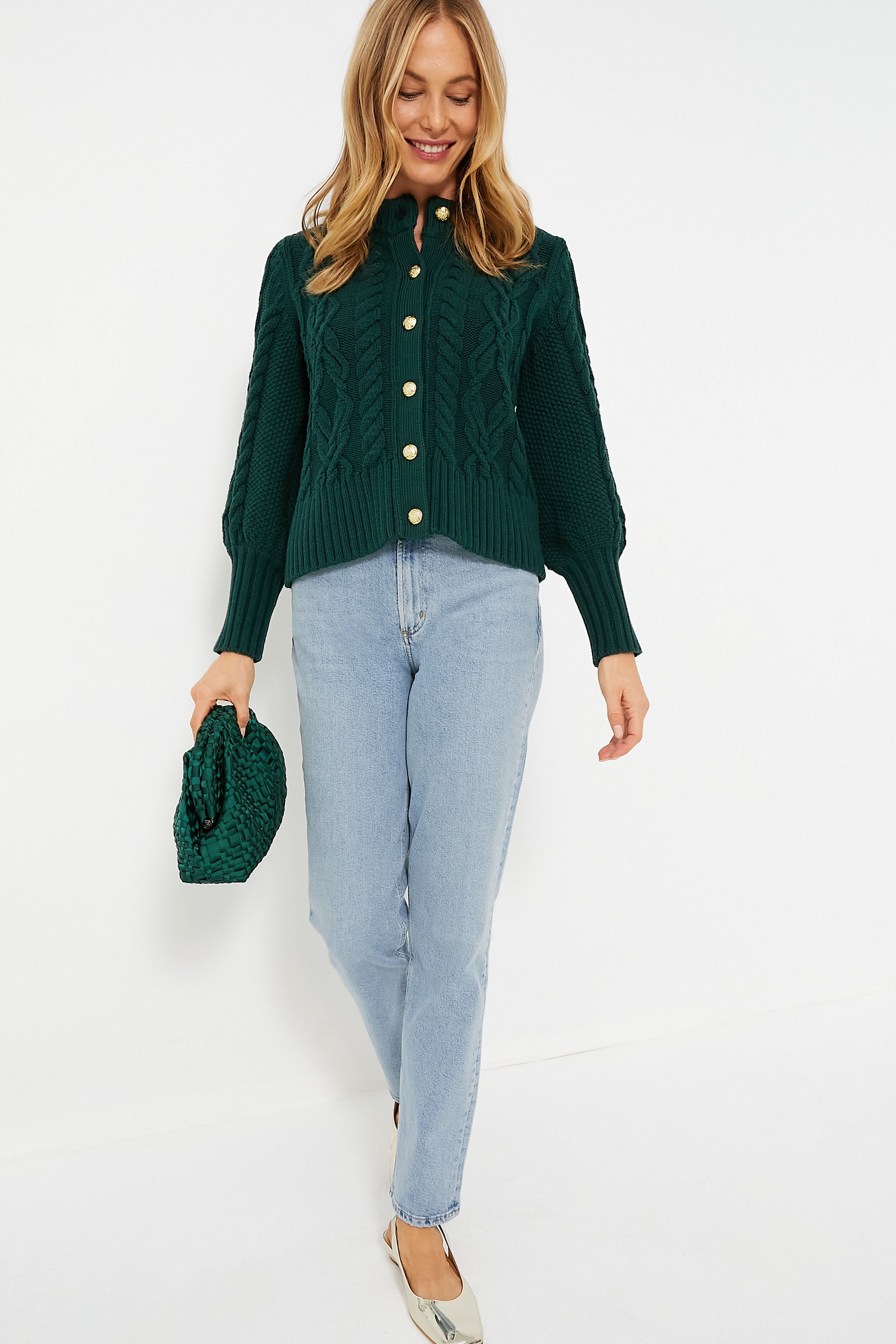 Chunky. cozy and always chic — the Evergreen Colette Cardigan takes the very best elements from the classic style and updates it with exaggerated bishop sleeves. gold buttons and a slightly cropped. but not too short length that makes it perfect for layering over dresses or styled solo with high waisted pants. Dressed up or down. in the office or out to dinner. the possibilities are endless with this transitional piece.