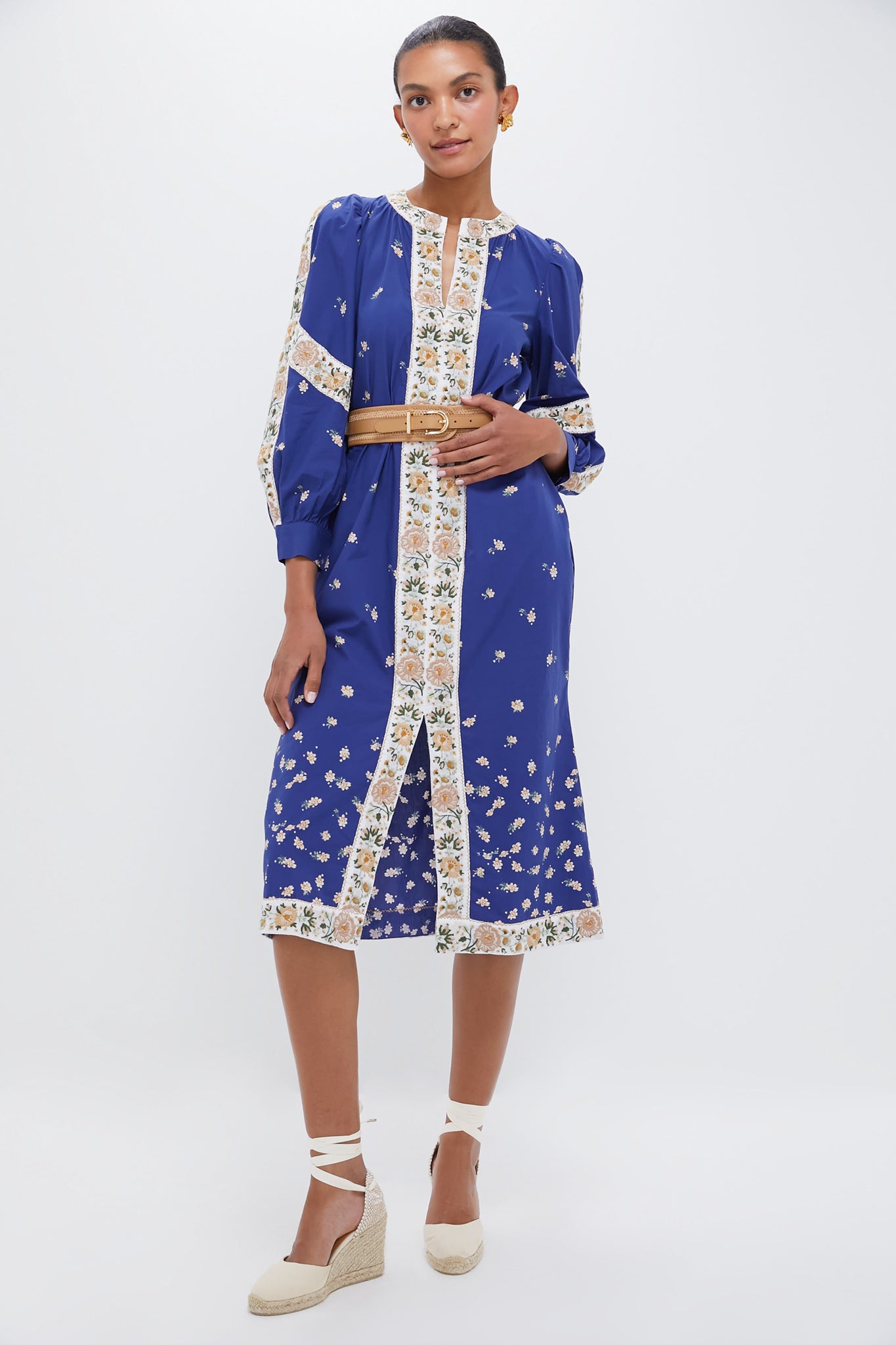 The Exclusive Blue Elizabeth Print Longsleeved Caftan Dress is perfect for day or night! Featuring a midi length. embroidered floral detailing. shift silhouette. and self tie belt. Throw on over a swim suit for a casual lunch. or pair with wedges and a clutch for dinner. You'll be glad this caftan made it into your carry-on!