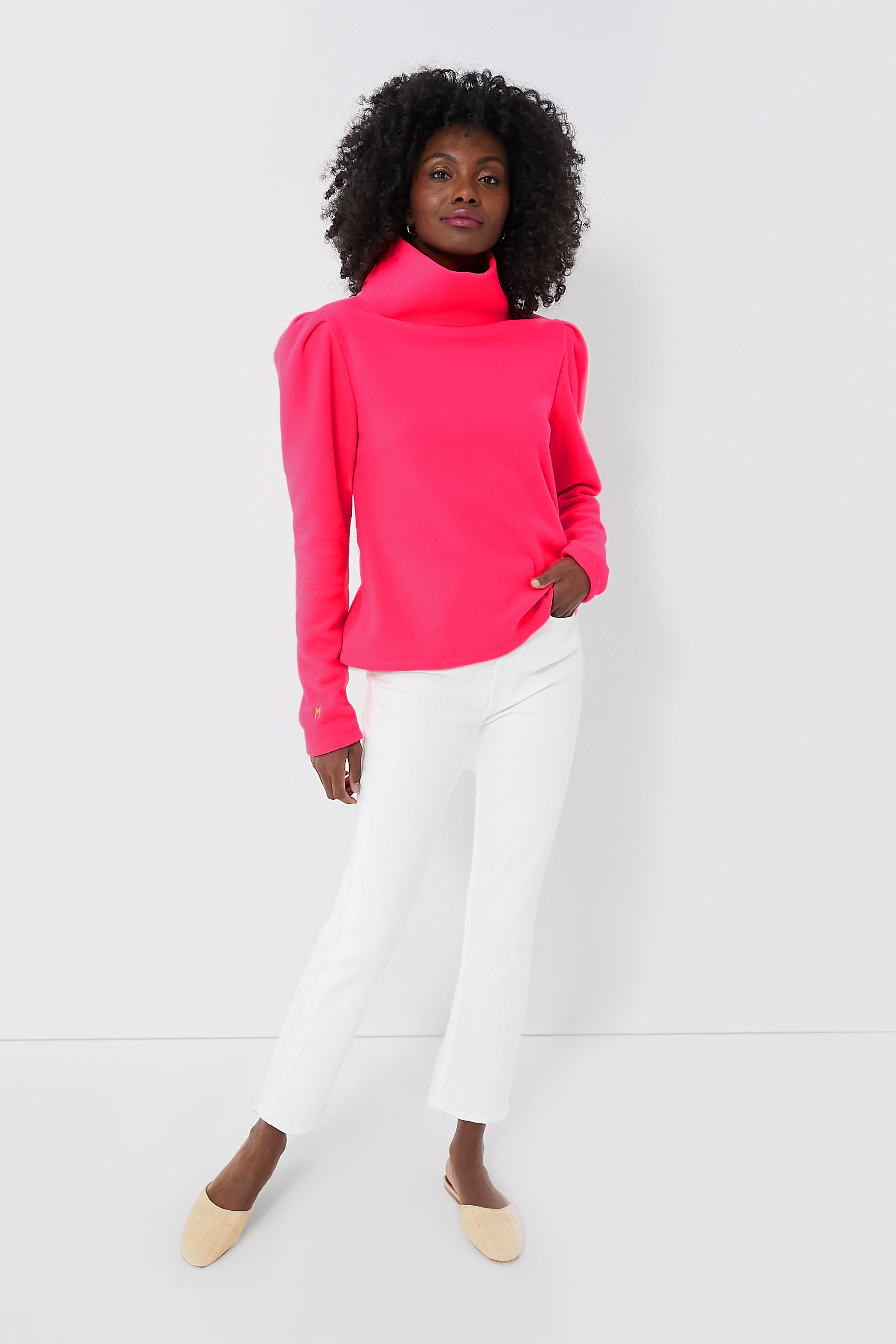 Who ever said cozy fleeces have to be boring? A Morningim exclusive style. the Neon Pink Palmer Vello adds a vibrant hue and feminine details like puffed shoulders to make this turtleneck feel a bit more interesting. A slightly cropped hem length makes this silhouette perfect for pairing with high waisted denim for weekend adventures or running errands. or with leggings or joggers when you're craving even more comfort.