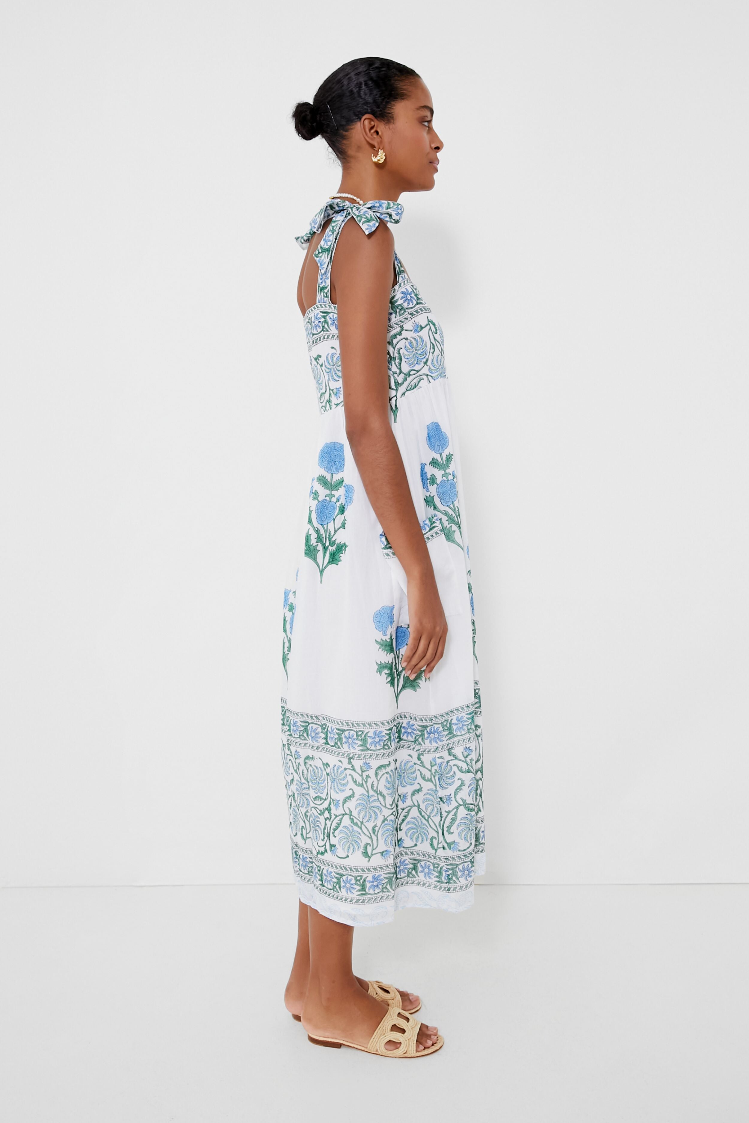 Exclusive to Morningim. the Poppy Tie Shoulder Dress is made from a hand-blocked floral print that brings some whimsical charm to this bohemian-inspired midi. Cut from breezy cotton. this silhouette takes classic details and elevates them until they feel feminine and fresh — think square neckline. self-tie shoulder straps. a button down front placket. and patch pockets at the hips. We are pairing it with espadrilles and neutral accessories for a playful look you will be excited to wear on sunny days!
