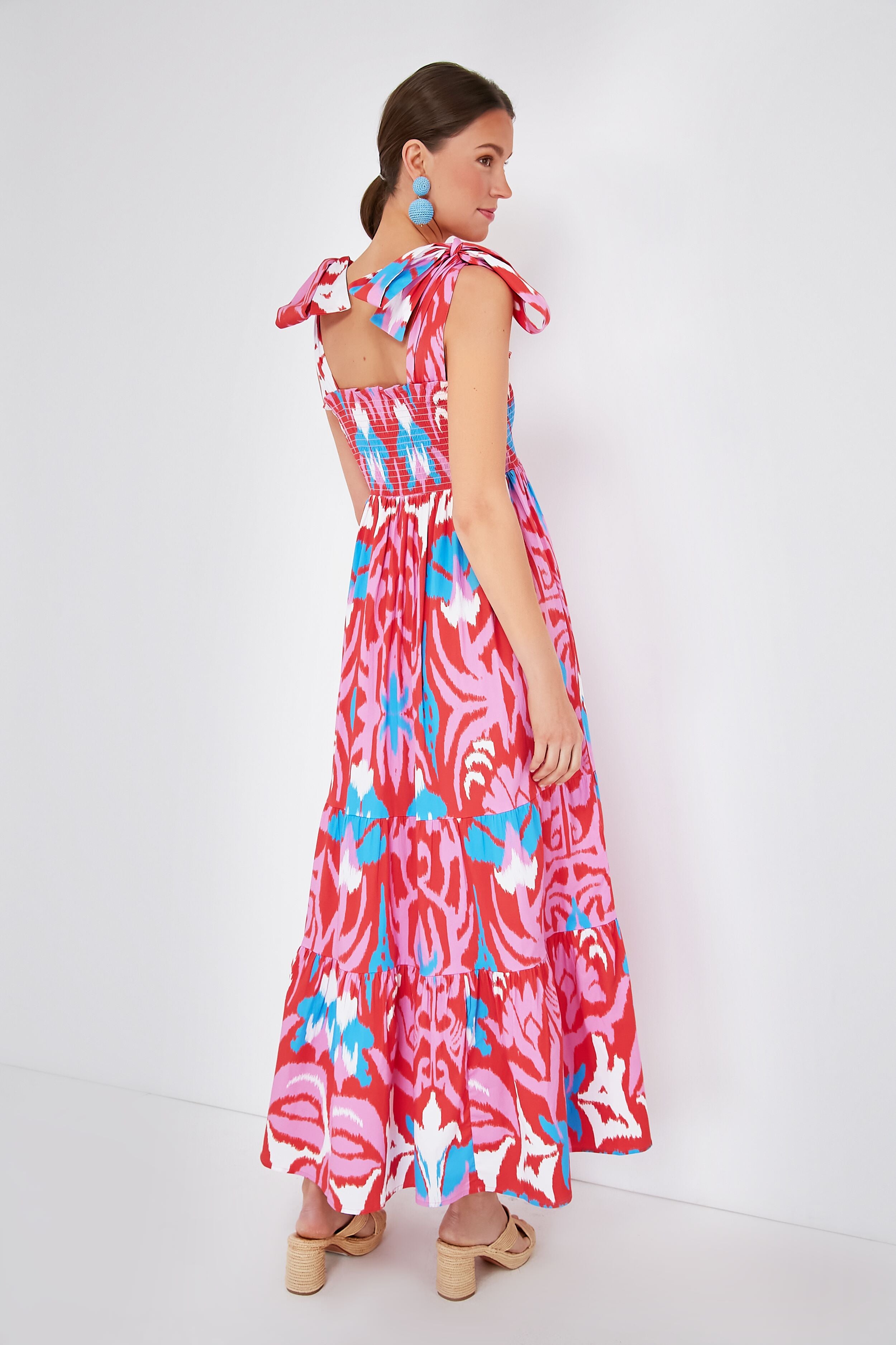 Our beach getaway is planned and this is the resort dress we're packing. The silhouette of your dreams in a Morningim exclusive colorway. the Red Multi Tulip Ikat Kelly Dress fully embodies easy elegance– and ensures you will be on the best-dressed list. Versatile enough to wear to a luncheon or wedding alike. the smocked bodice. tie shoulder straps. and flattering fit make this maxi one of our must haves for warm weather dressing.