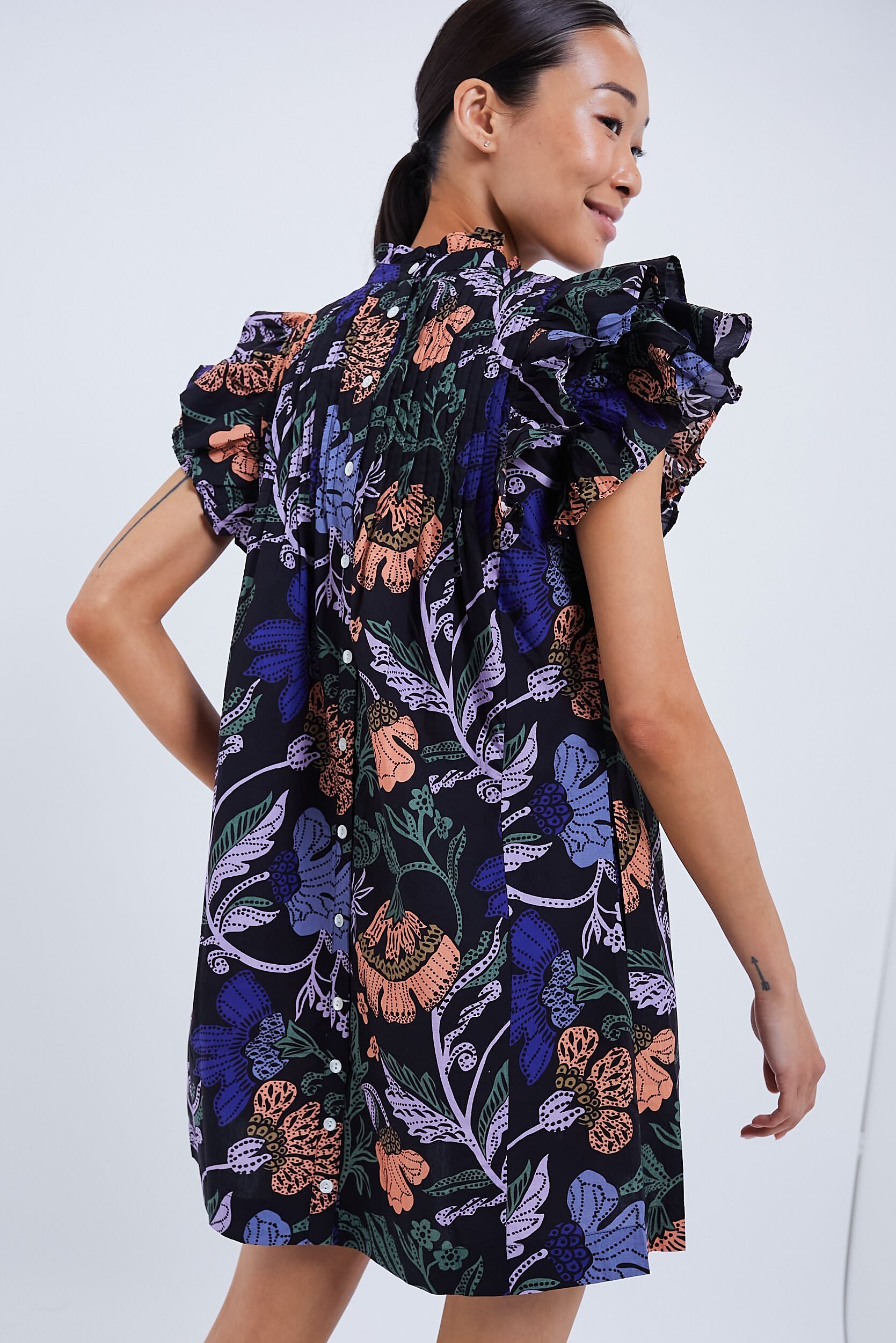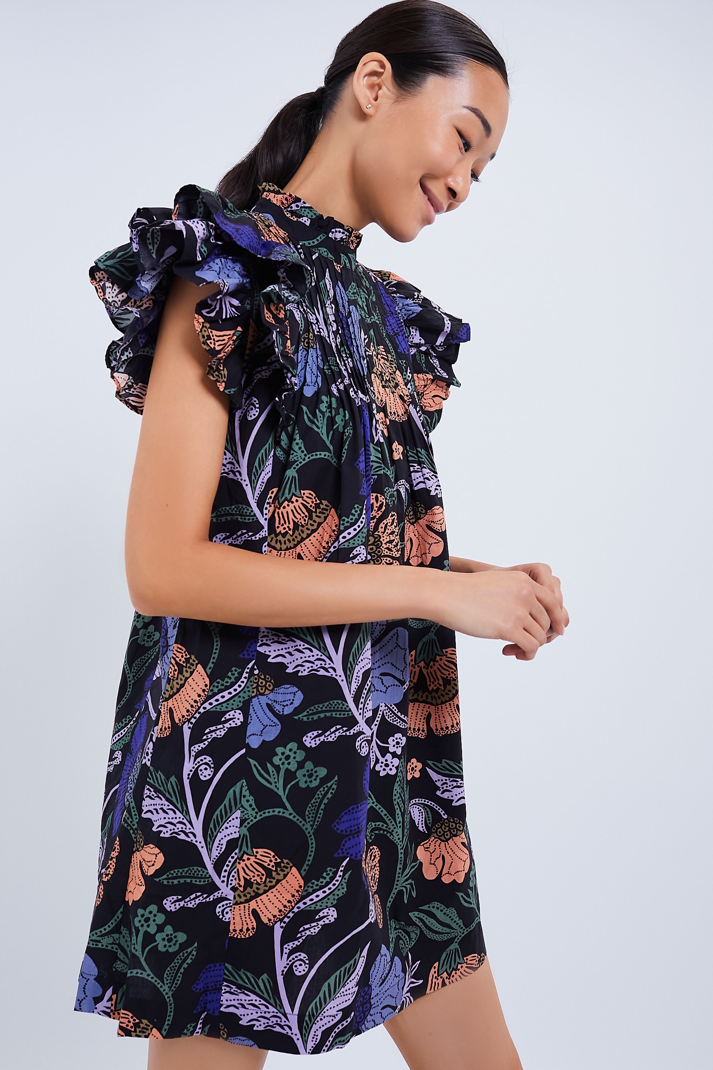 In an Exclusive Turnin Peri Black Floral print. this mini will have you more than ready for all your fun plans ahead with its ruffled flutter sleeves and a swingy hem bringing flowy movement that we can't get enough of! Style for a girls lunch with sandals and gold jewelry. or pair with cowboy boots and a wide brim hat for your next trip to the countryside.