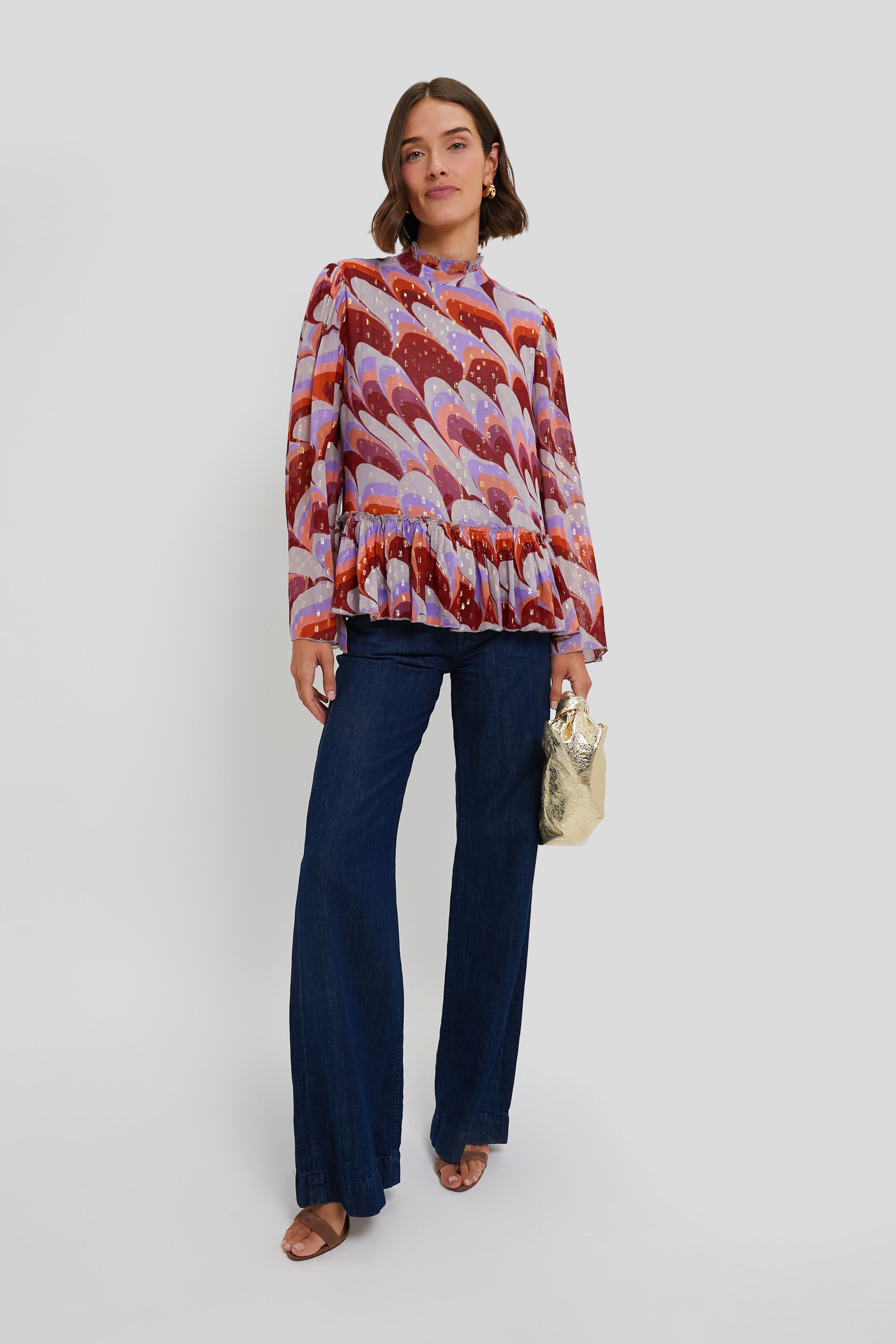 Brighten any day by throwing on the Exclusive Venice Cognac Peplum Blouse. Bursting with color. textured fabric. and a playful design. this top is eye-catching while still being elegant and versatile. The lightweight fabric ensures comfort. while the ruffle collar and hem add dimension and character. Style this with dark pants and sandals. or with off-white trousers and statement earrings.