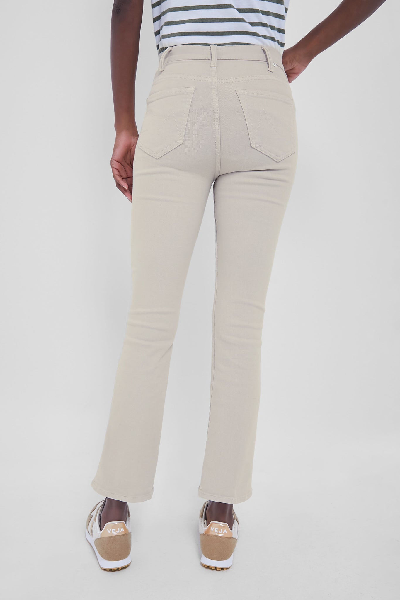 Cut from stretch fabric. this high-rise flare silhouette is finished with clean hem and tonal hardware. With a light gray color that will complement any top you style it with. pair with a body suit and heels for a night out. or with sneakers and a top for a casual day around town.