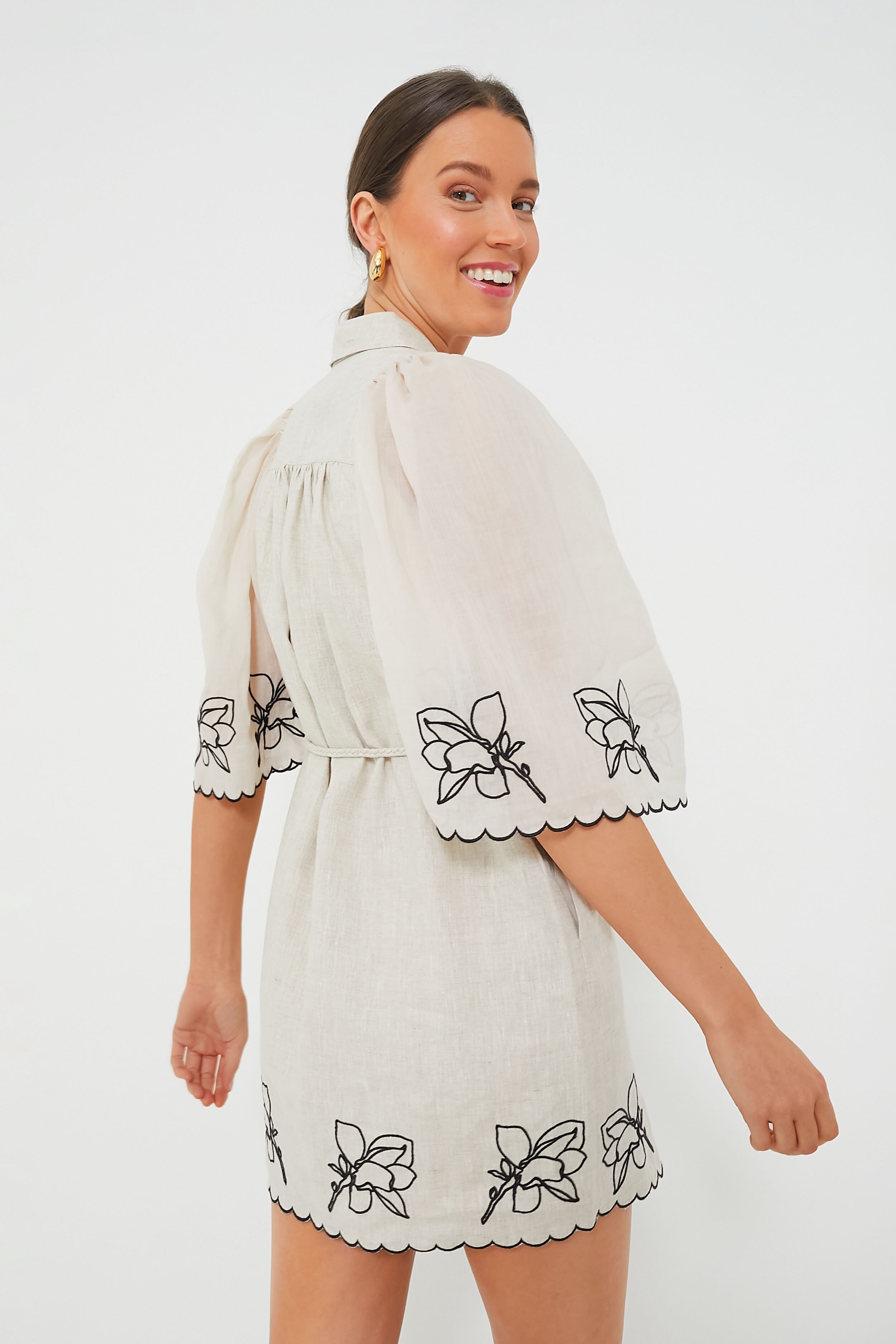Timeless and simple. yet effortlessly elegant. the Flax Black Hattie Linen Embroidered Mini Smocked Shirt Dress is a unique warm-weather piece. The linen body makes this style easy and breathable with elevated elements such as the embroidered detailing and scalloped edging. A removable self-tie waistband allows for a more fitted look. while the puff shoulders and collar give structure to an otherwise relaxed silhouette. Pair with simple black ballet flats or dress up with wedges and gold jewelry.