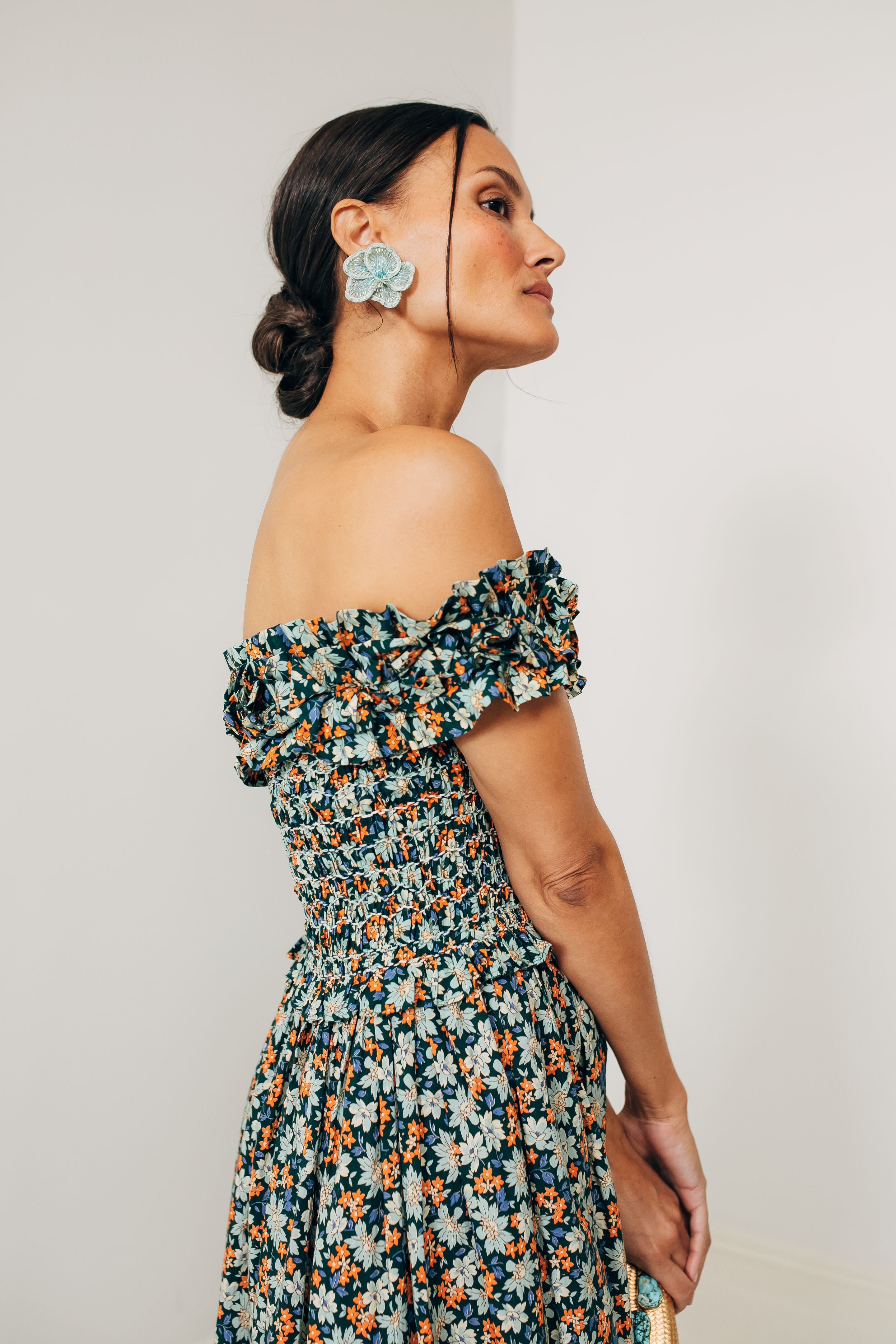 There is no silhouette quite as idyllic and whimsical as the Forrest Peggy Floral Dress. With nature-inspired shades of deep green. creamy yellow. and brilliant orange that come together to create a fresh botanical print. this midi features an off the shoulder neckline with ruffle detailing and a smocked bodice that is equal parts romantic and super-comfortable. Add heeled sandals and a clutch for tropical escapes. garden parties. warm-weather weddings. you name it!