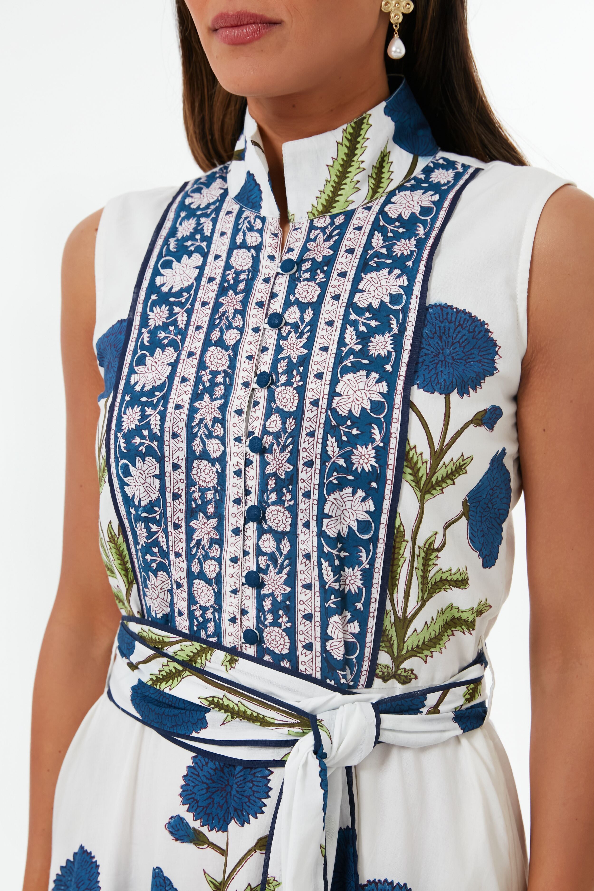 A sleeveless version of the best-selling style. the French Blue Marigold Flounce Dress uses the same stunning block-printing techniques we know and love. as well as saturated blue hues. This flouncy. textural beauty will take you from the beach to dinner to an outdoor event with ultimate ease. helping you create a relaxed yet put-together look. The details are endless — a Nehru stand collar. covered buttons at the half placket. and a self-tie waist sash are just a few that we are loving. This closet-favorite is a magnificent wear-everywhere style. so complete your look by adding wedges and a clutch to attend a seaside wedding. or with a tote and gold hoops for sunny brunches with your friends.