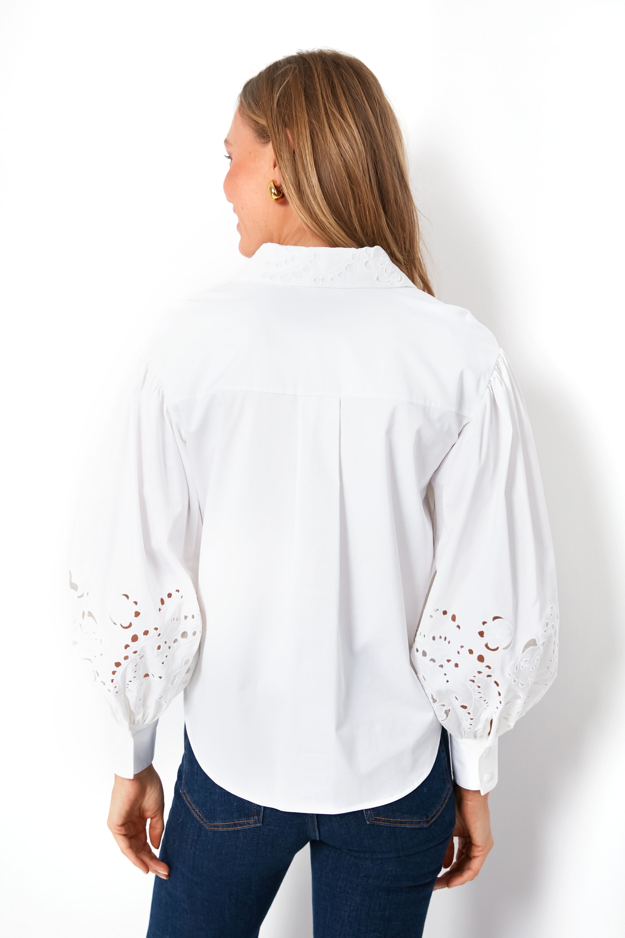 The French Cream Poplin Embroidered Cutwork Shirt will quickly take over as your new go-to blouse. Equally appropriate for the office or brunch. this cream-hued top is made from a crisp cotton-blend poplin with broderie anglaise trim on the sleeves for a dash of added romance. Add denim or trousers. flats or heels. bold jewelry or a neutral clutch– the choice is yours when it comes to this versatile styling piece.