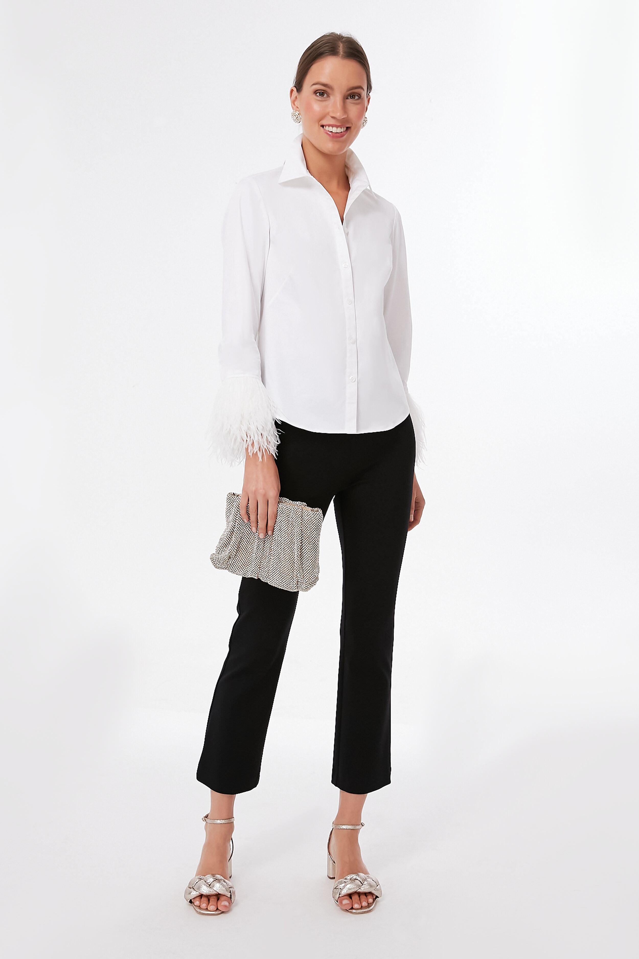 Everything's better with a bit of fluff...which is why we love the Fresh White Feather Trim Poplin Shirt. Think your classic button down with some added sass. featuring a point collar. slim fit. and (we saved the best for last) ostrich feather cuffs. this top really does it all. Pair with luxe trousers and party heels for office parties. festive celebrations. or a night out with the gals.