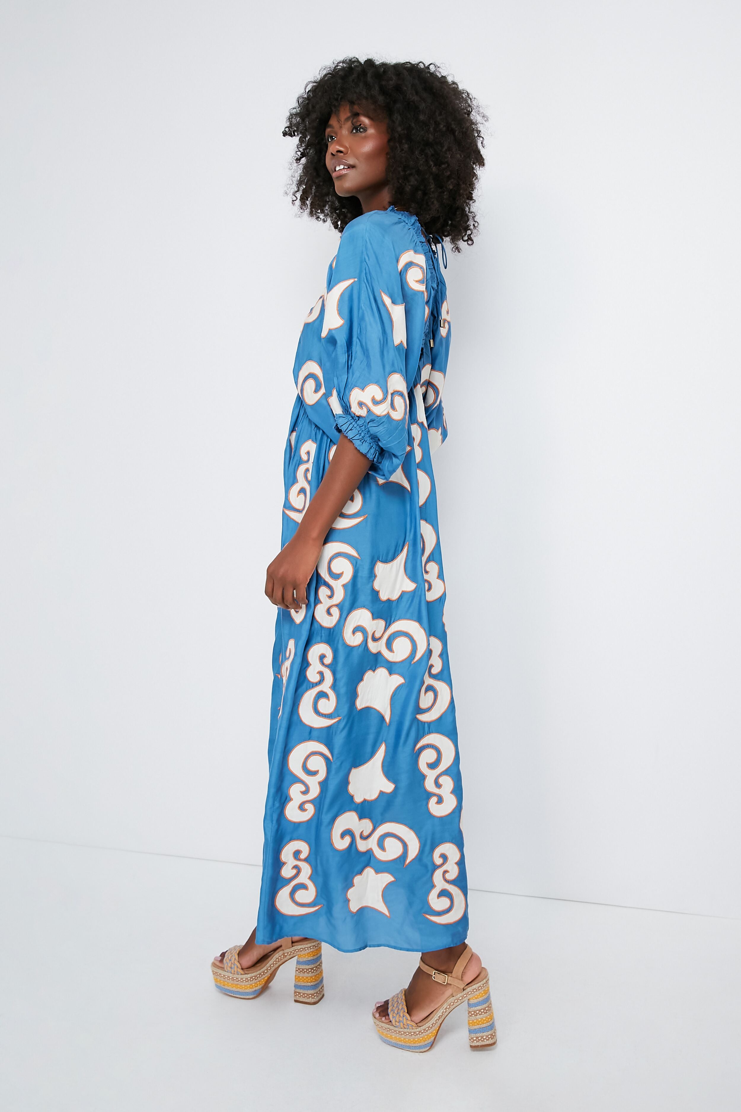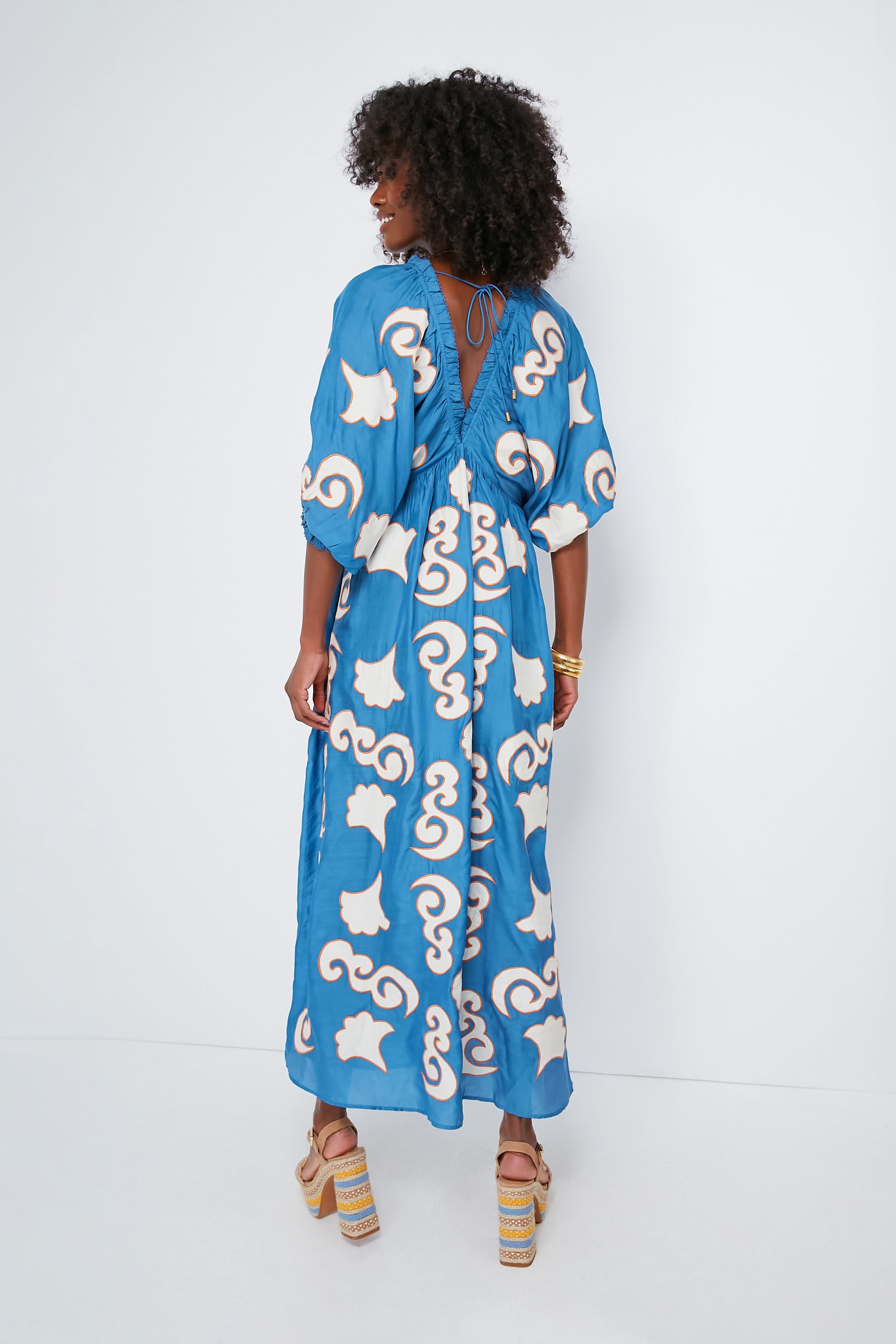 Featuring hand-embroidered patches in stunning organic shapes. the Gagan Sky Lucia Dress is full of charm. Its deep V-neckline is complemented by each of the many lovely details. including voluminous elbow-length balloon sleeves. a self-tie back. and a full-length hem. Style with sky high raffia heels or espadrilles for an incredible resort look that will have heads turning your direction. or with flat sandals for dinners spent with friends.