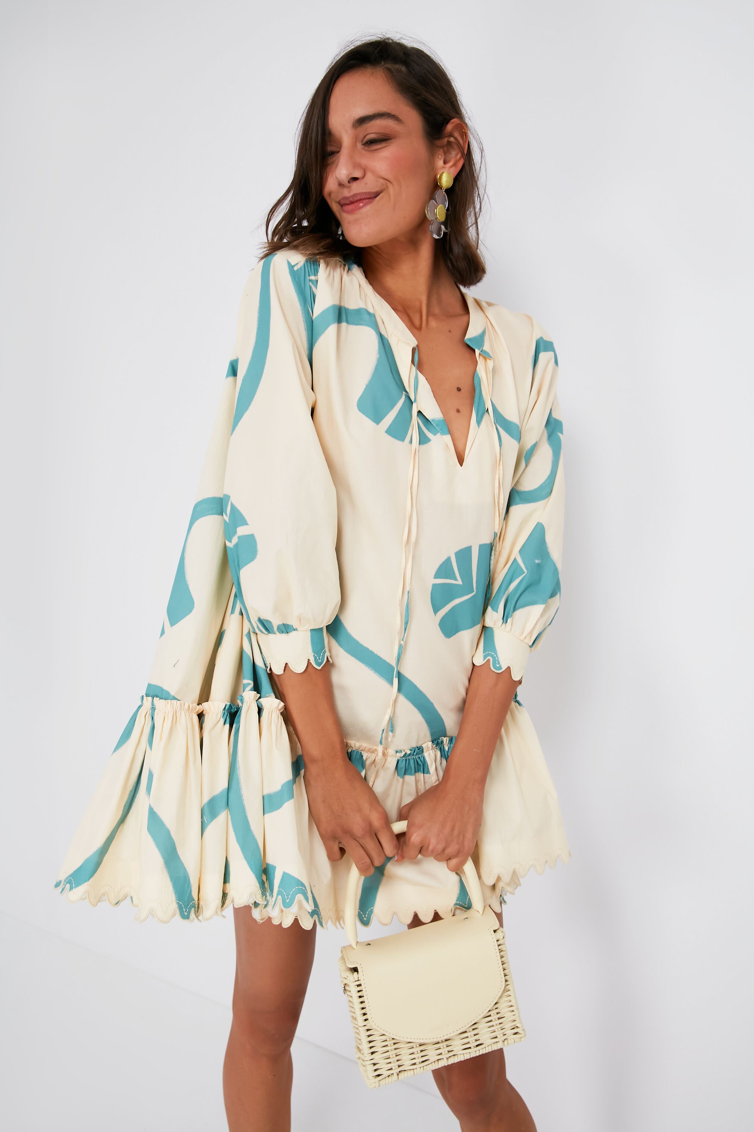 A superb piece for al fresco brunch dates and afternoon strolls in the park. the Geometria Colonial Dress is absolutely darling. This swingy. A-line silhouette with a dropped waist has a relaxed feel to it that is perfect for vacation-wear or for an elevated daytime look. as well as a banded neckline with delicate ties. scalloped cuffs. and a ruffled hem. Abstract palms add the finishing touch to this chic cotton number that was made to be paired with funky sandals and a whole lot of sunshine.