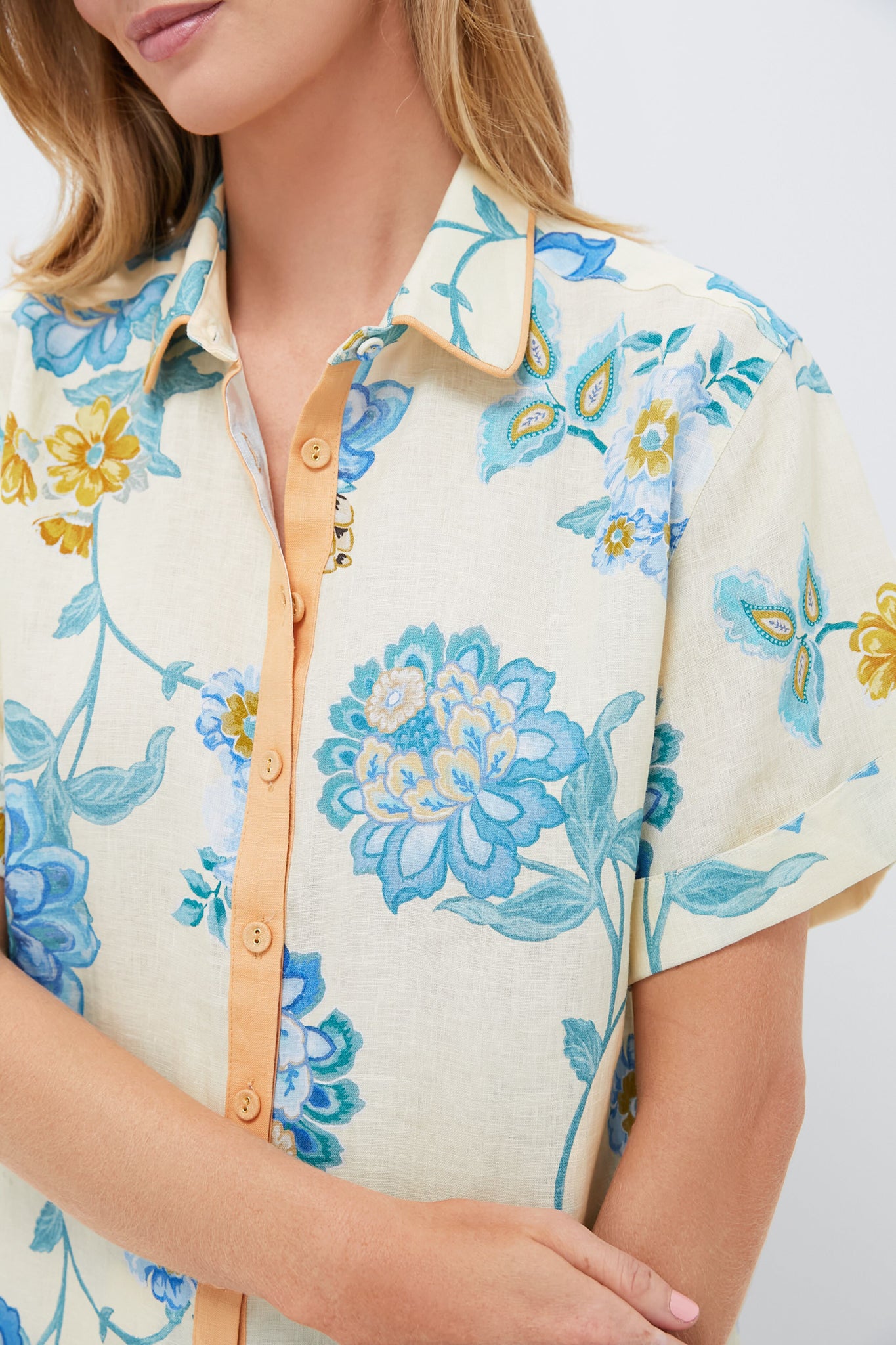 The Giselle Shirt features a relaxed fit. short sleeves with rolled cuffs. and contrast button detail complete with contrast piping at the collar edge. Style with the matching Giselle Mini Skirt. sandals. and a mini bag for a versatile vacation look!