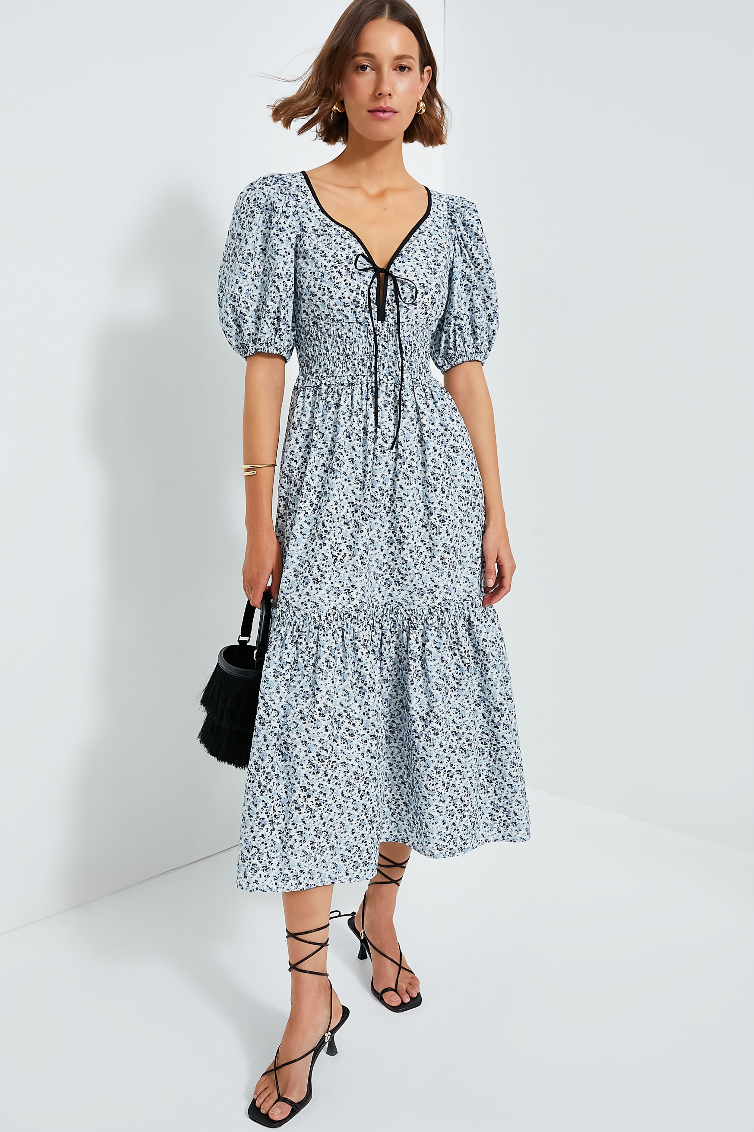 This Glacier Lake Printed Cotton Long Smock Dress combines classic femininity with modern details. The flattering midi silhouette boasts short puff sleeves. a V-neckline with a self-tie closure. and a smocked waist that flows into a tiered A-line skirt. The ditsy blue florals remind us of simple summer days spent outside. Pair with ballet flats or kitten heels for a chic look.