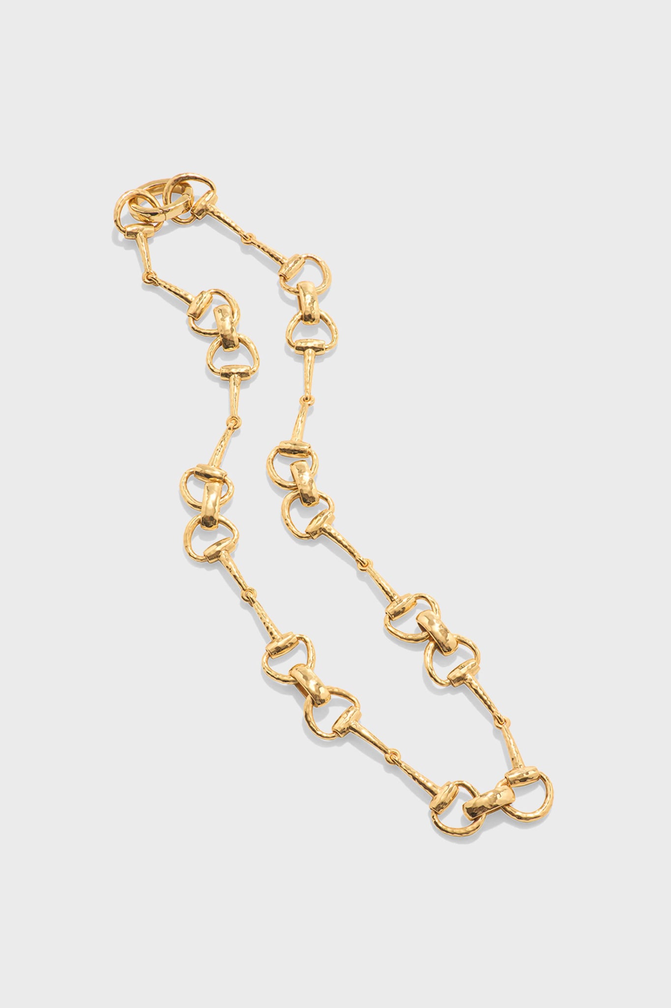 For those who love the majesty of horses. the Gold Equestrian Snaffle Bit Chain Necklace is timeless. sculptural and chic. Crafted from gold plated brass. this jewelry delivers the perfect dose of glamor and gumption to your favorite pair of jeans or cocktail dress.