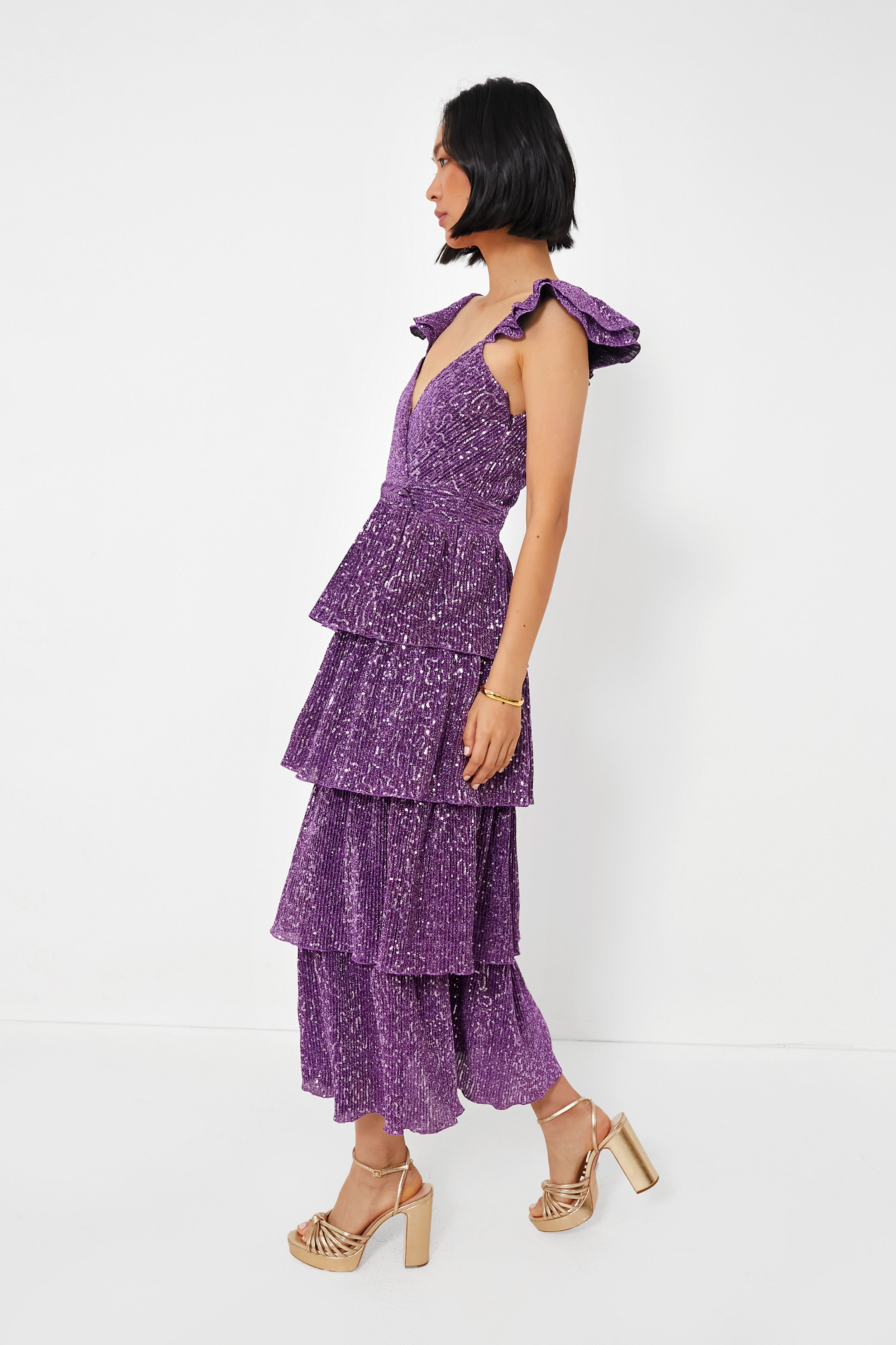 The key to a memorable evening is a memorable outfit. and there's no better choice than the Grape Karmen Dress. This metallic pleat midi is cut from a sparkling fabric in a gorgeous purple hue. Ruffle straps. a sweetheart neckline. and tiered skirt makes this piece a show stopper. Add heels and statement earrings. then get ready to dance the night away.