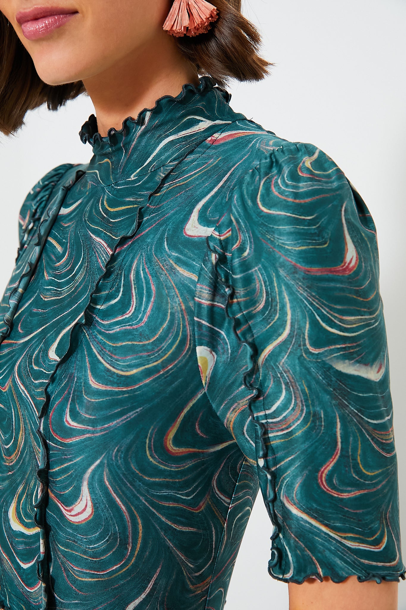 - Mock ruffle neckline