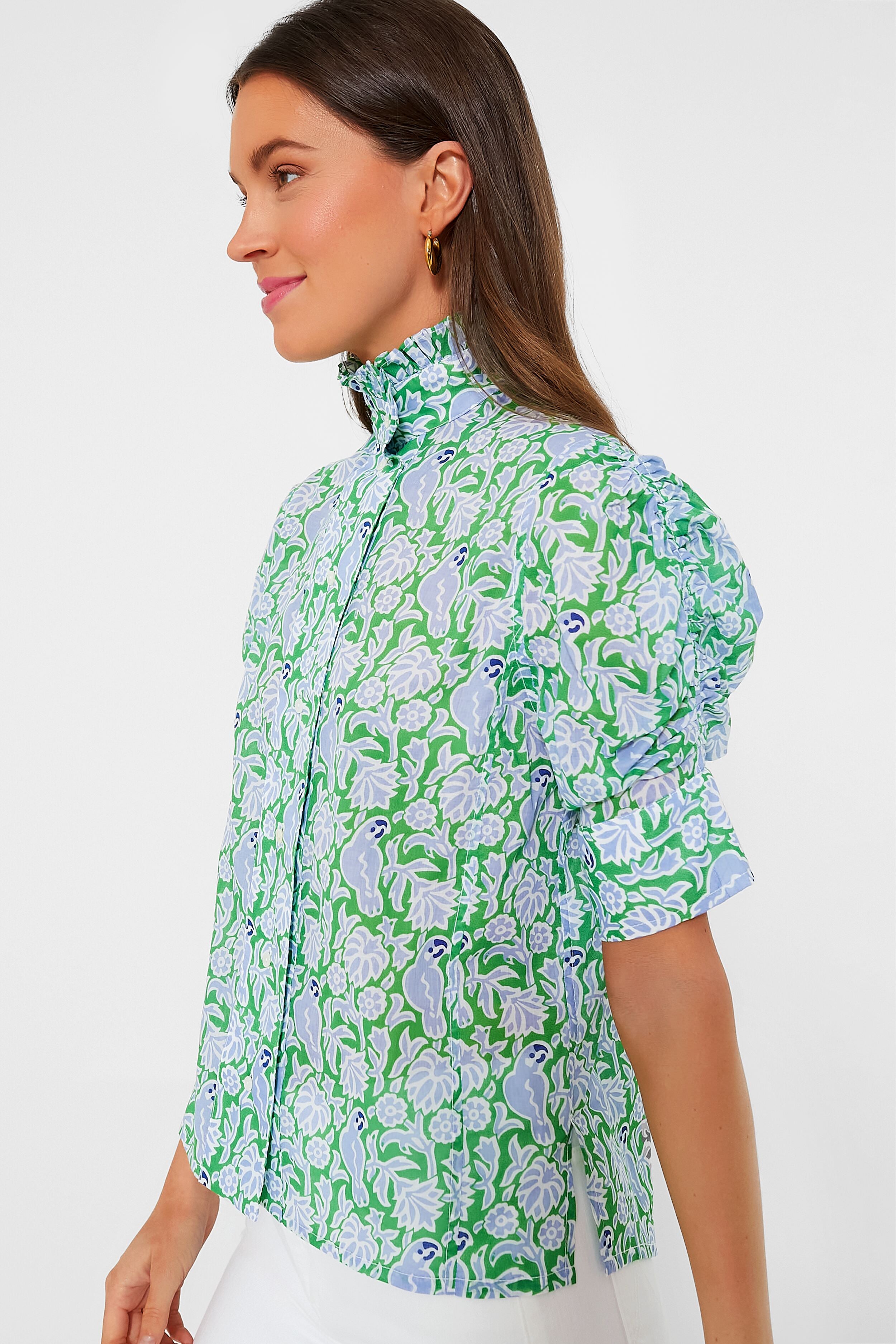Fresh and floral. the Green and Blue Vita Blouse is beautifully structured silhouette we can't stop thinking about! Featuring a ruffled collar. short gigot sleeves. and a front button placket. this hand block printed top is a fun twist on the traditional button-down. The soft cotton and relaxed fit helps this style feel effortless and cool enough for everyday wear with white denim. distressed shorts. or polished trousers.