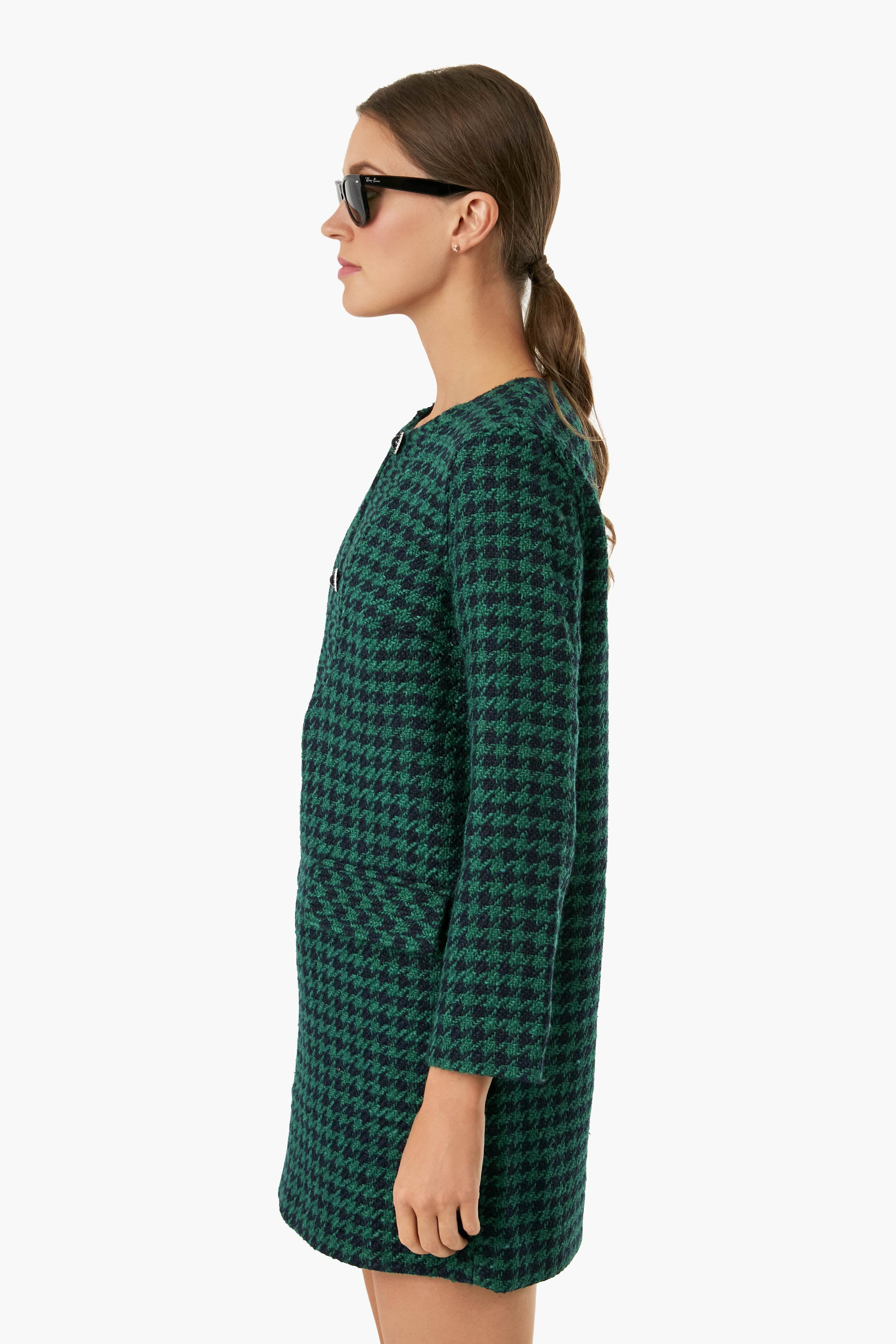 The Green Check Ayla dress is a bouclé mini that features long sleeves. a button front placket. and front patch pockets. In a houndstooth pattern and fully lined. this classic number is a combination of bold. cool-girl prep. Pair it with boots and a sunnies for a striking. city chic look.