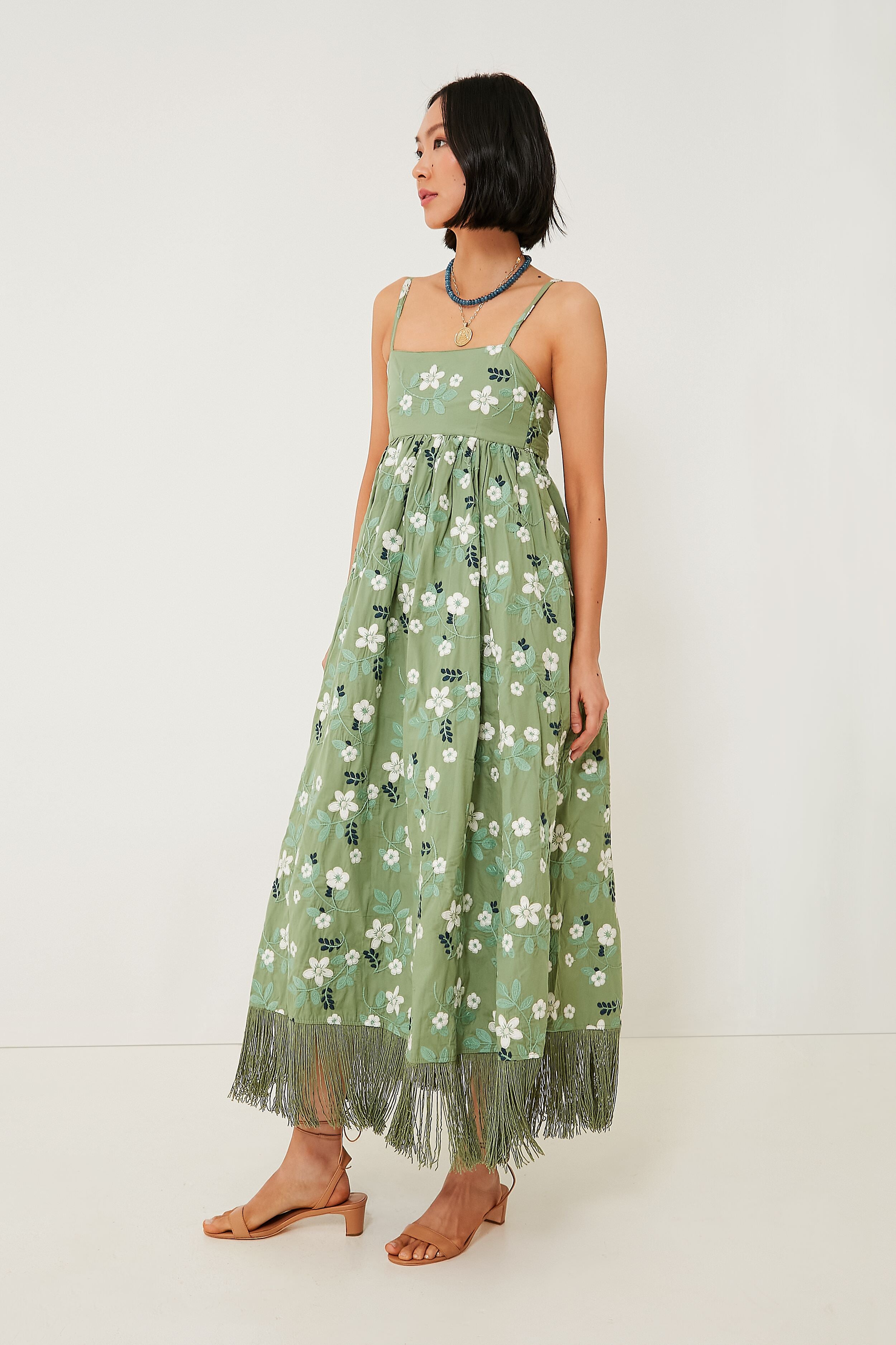 If you love a bold silhouette. the Green Gavin Dress is for you. In a stunning sage hue adorned with all-over floral embroidery. this midi has a square neckline. thin shoulder straps that can be adjusted for a perfect fit. a beautiful tie-back detail and — get this — a tonal fringed hem that swishes with movement as you walk and spin. This is a must-have style for any event coming up on your social calendar. so just pair with heels and a clutch to go more simple. or add some statement jewelry to lean into the maximalism.