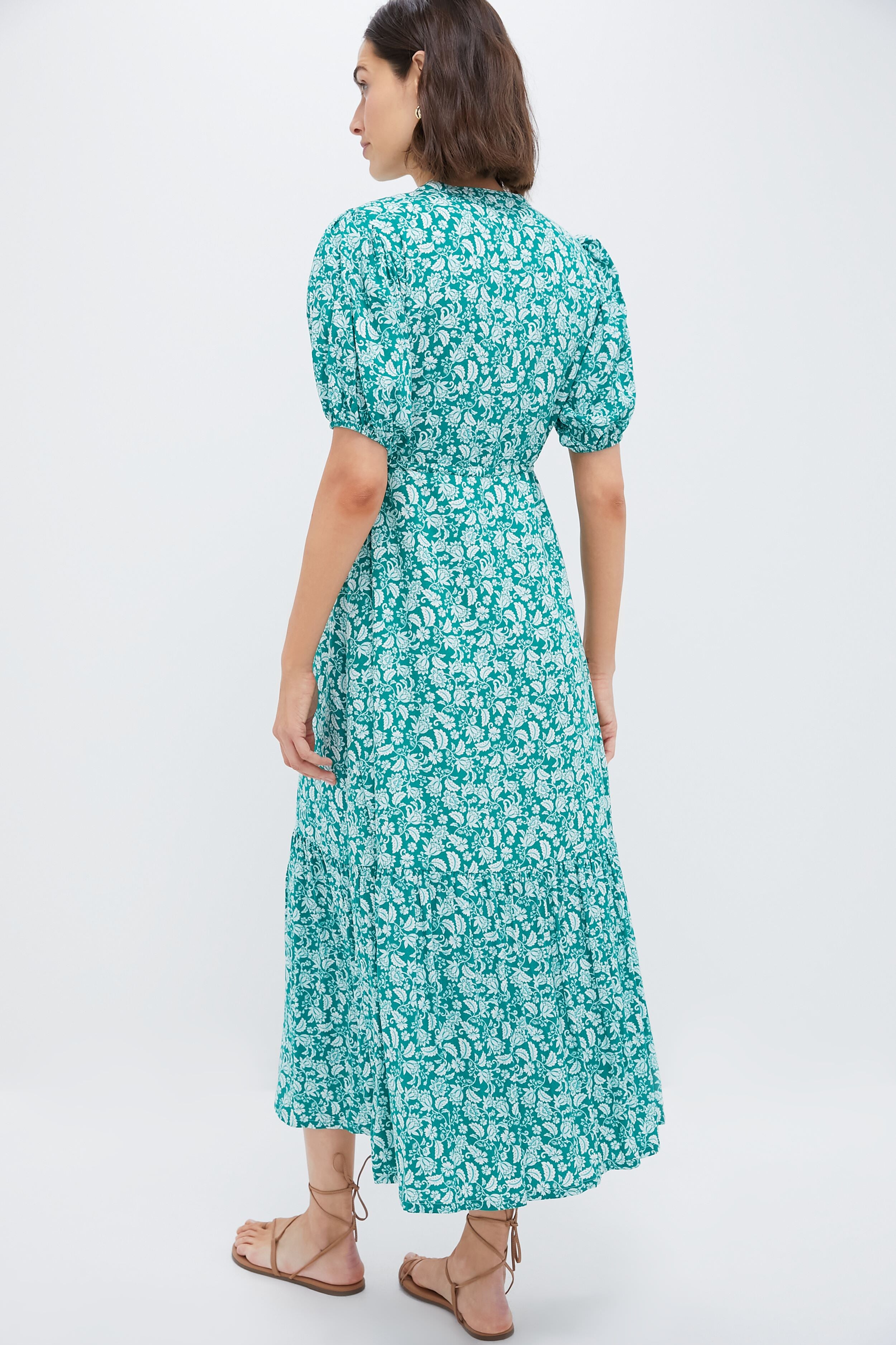 The Green Micro Floral Frannie Maxi Dress is an elegant addition to your warm-weather closet. A feminine silhouette featuring short puff sleeves. an adjustable drawstring waist. and a tiered ruffle skirt. this look is perfect for brunches. luncheons. showers. and everything in between! Simply pair with your favorite sandals or espadrilles and you are ready to go.