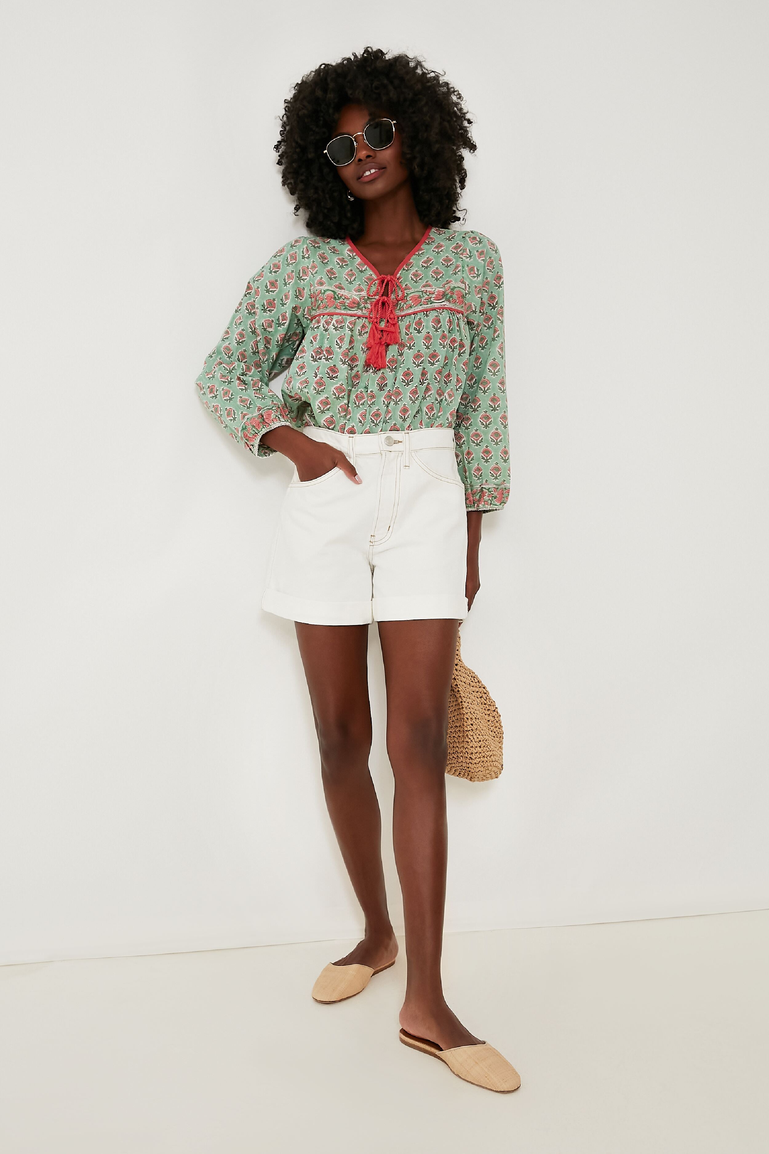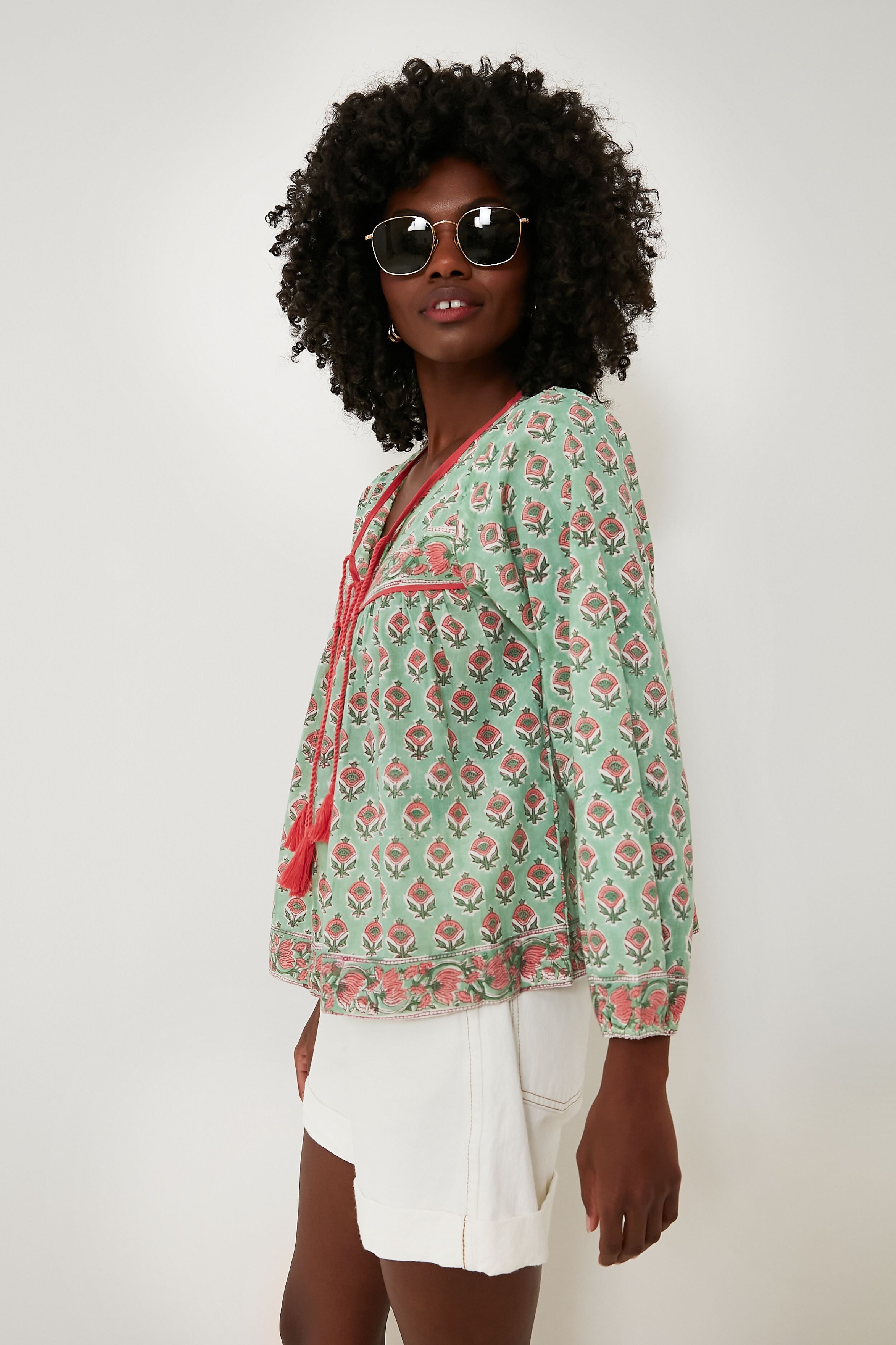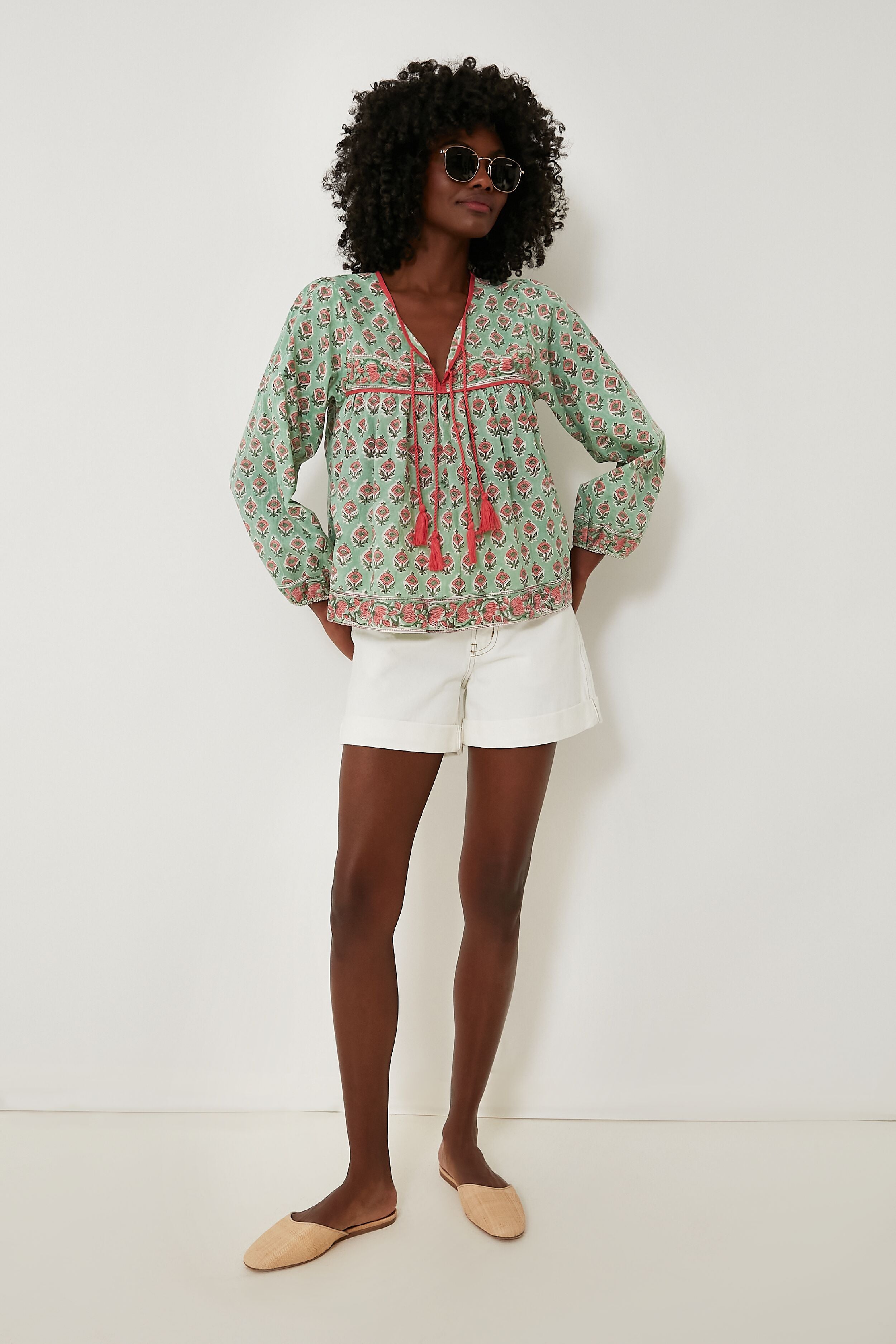 In saturated shades perfect for bright and sunshiny days. the Green Multi Top is unapologetically sweet and full of summer appeal. A notched neckline with double tassel ties. long blouson sleeves. and a contrast border print at the hem all bring in hints of bohemian style to complete this silhouette. Comfortable. flattering. and made from airy cotton. this shirt is about to be on every packing list for weekend trips this season — just pair with cutoffs and sandals or denim and sunnies and you're ready for a fun-filled day!