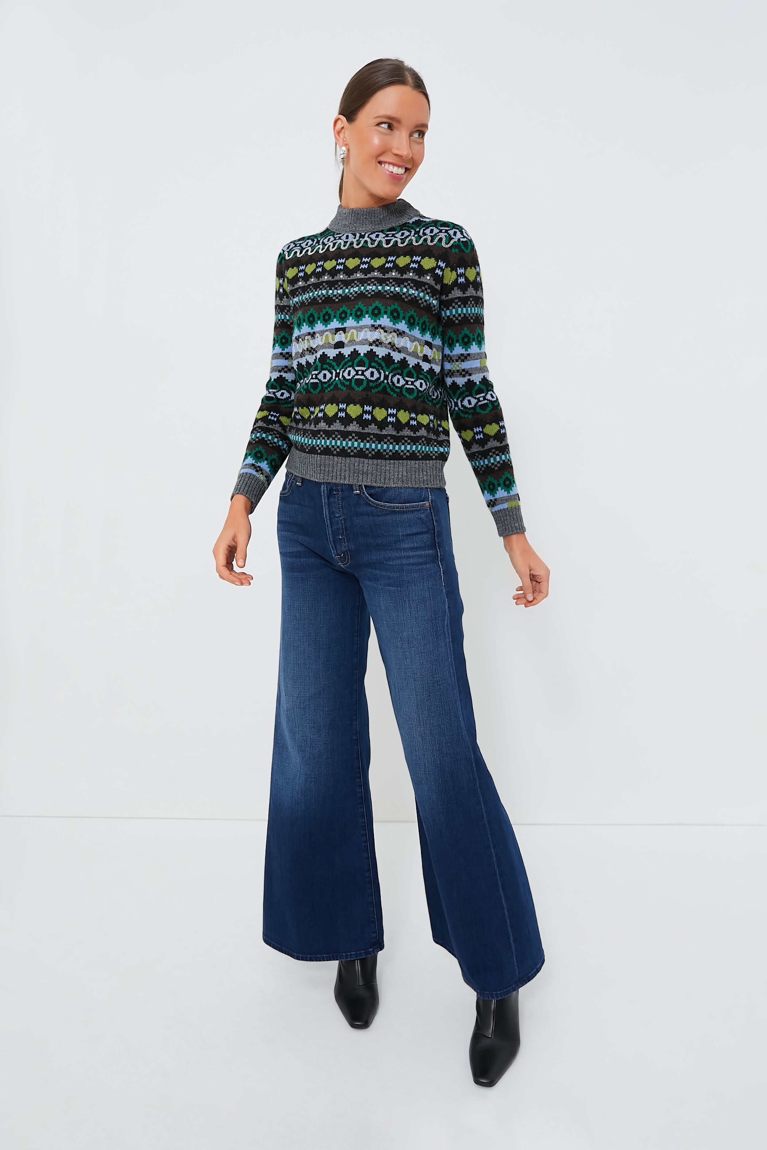Crafted from a luxurious alpaca and wool yarn. you'll never want to take off the Green Opaco Sweater. Designed with a crew neck and ribbed hem. the beautiful fair isle pattern with rhinestones adds an eye-catching detail to this knit top. Style with your go-to denim. neutral-toned boots. and a tote for a chic weekday ensemble.