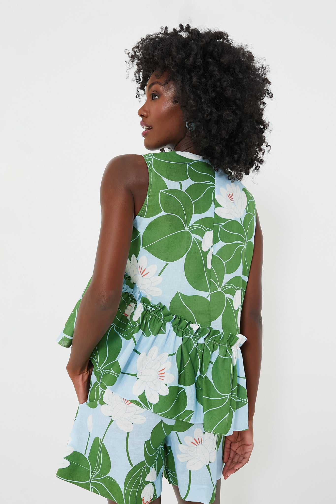 We can't help but feel cute and confident in the Green Waterlily Alora Top. Crafted from an airy linen blend. this simple. yet striking piece boasts an eye-catching tropical print with an asymmetric ruffle hem. and an elegant gathered neckline. Pair with the matching Bizzy Shorts for a full-fledge set moment or pair with your favorite denim and sandals for an ultimate cool-girl look.