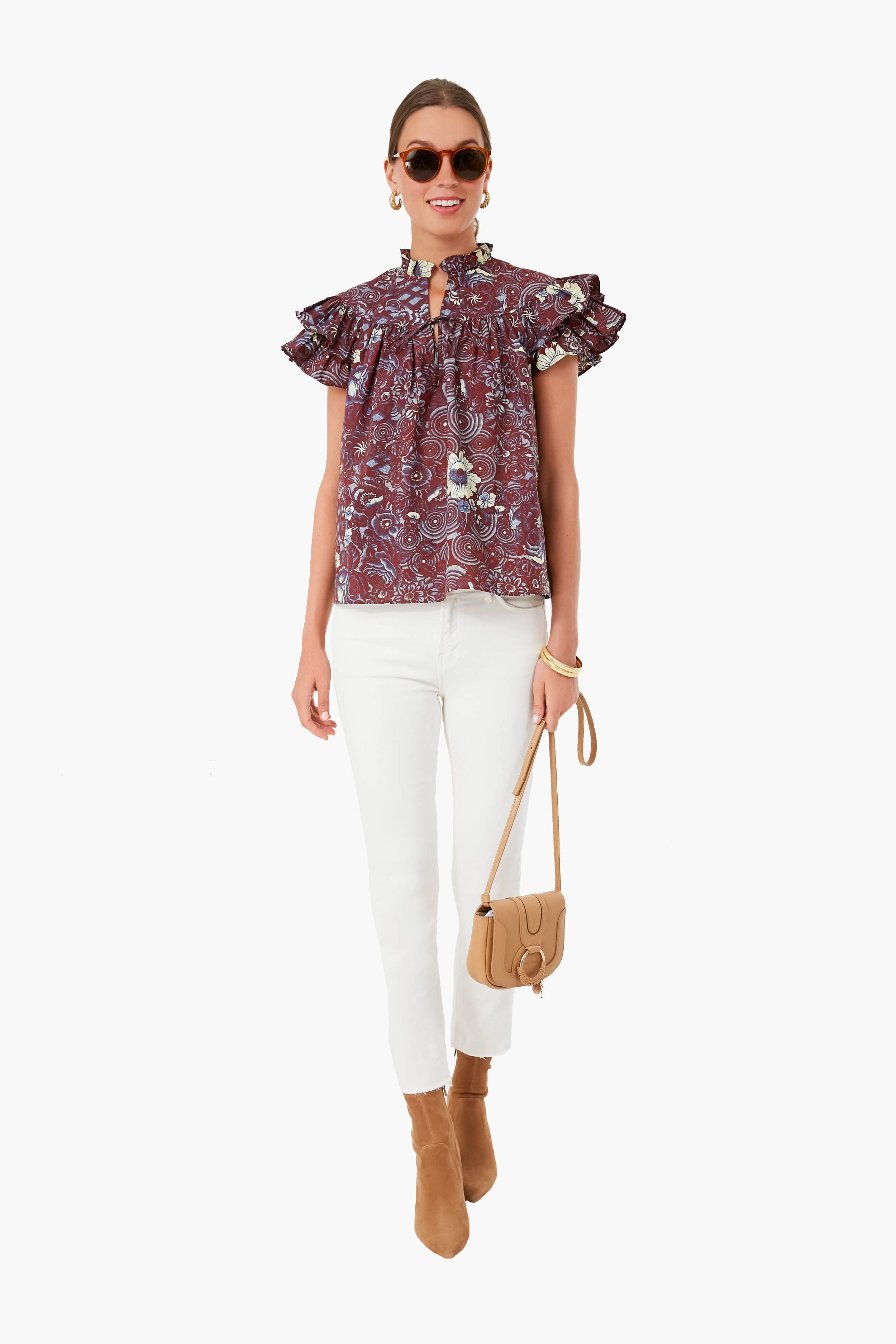 The Heliotrope Letty Top is designed in psychedelic printed cotton poplin. made of pastel florals and swirls against a deep-purple background. This blouse features a ruffled stand collar. a notched neckline with tie-closure that can be worn open or closed. and layered flutter sleeves for a dramatic look. Wear this versatile style with trousers to the office or with denim and a tote bag for a midday lunch with friends.