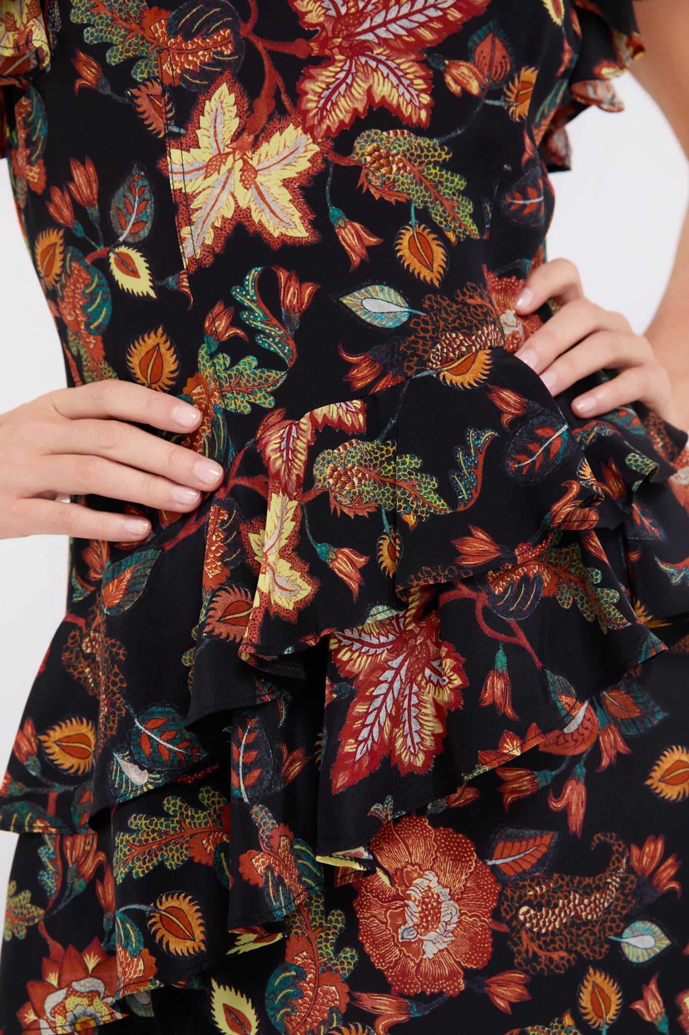 The Amaia Dress is richly patterned with florals rendered from a custom. hand-painted artwork created by a master textile artisan in India. The eye-catching print is accompanied by a feminine silhouette with ruffle tiers and flutter sleeves. Pair with boots or heels for a season-less look that is sure to gain compliments.