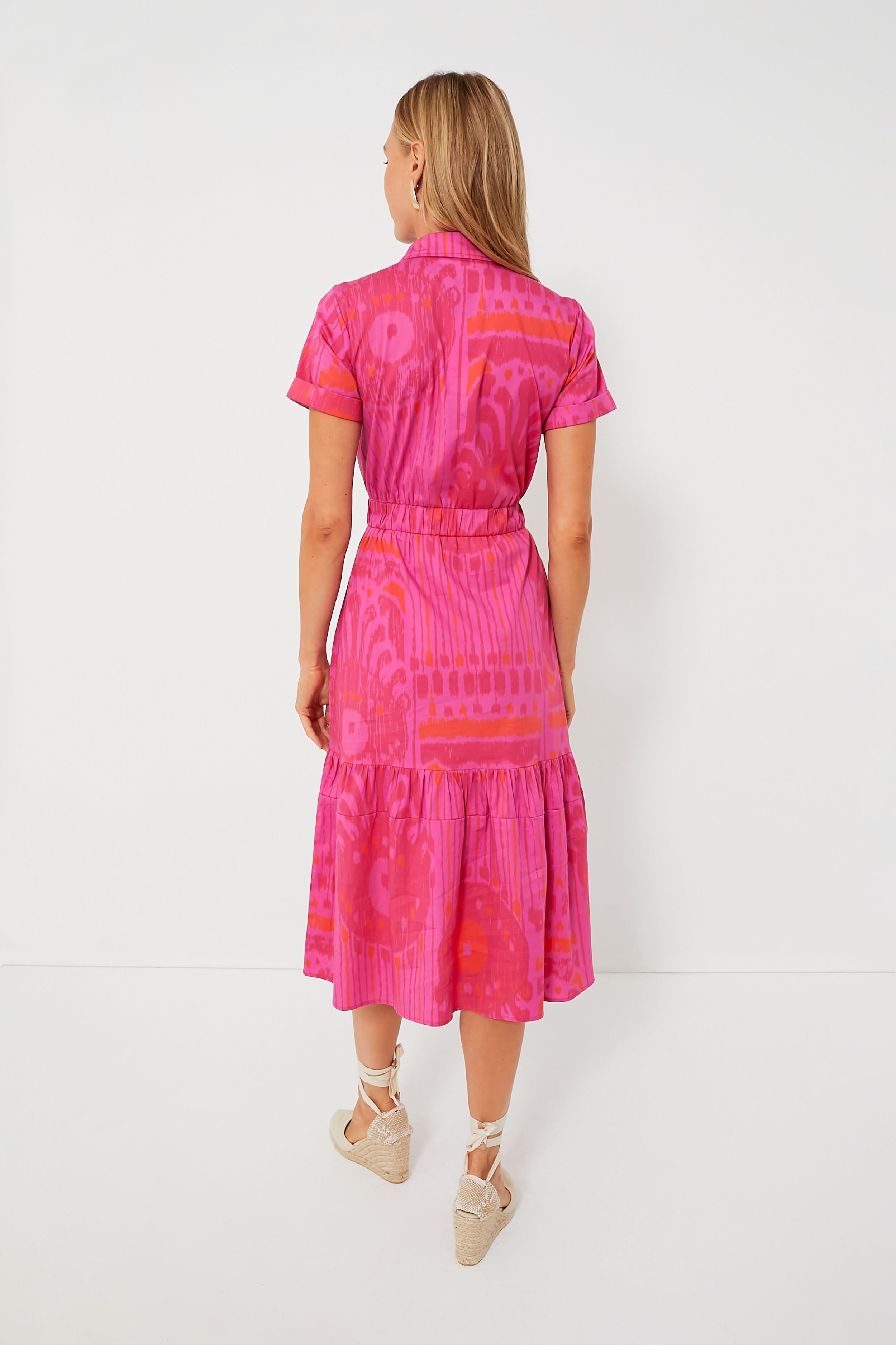 Bring a pop of color to your look with the bright and fun Moroccan Ikat Gwenyth Dress. Delivering an exceptionally flattering silhouette. this midi features a covered front button placket with hand-embellished details. and elasticated waist. and a breezy skirt. Since this sweet and striking style can be the main event all on its own. it is great for pairing with crisp white sneakers on weekend trips. or for dinner al fresco with wedges and statement earrings.