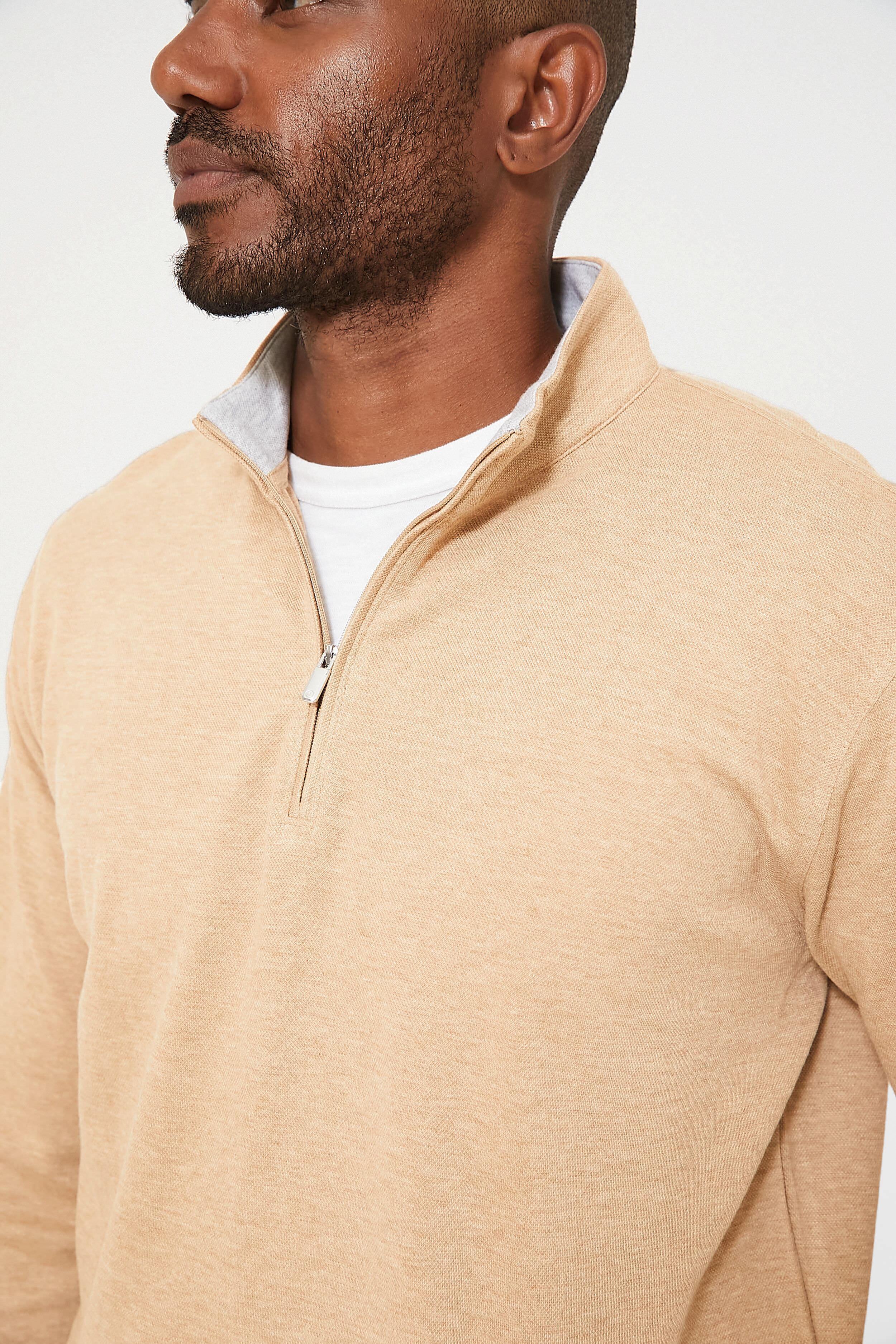 Crafted with a piqué stitch from a soft cotton-modal blend. the Irish Cream Crown Pullover offers sweatshirt-like comfort in a classic quarter-zip style. Featuring a stand collar and four-way stretch. this versatile layer can easily transition from casual workplaces to the weekend. Style with khakis. loafers. and a button-down for the office. or pair with denim. a graphic tee. and sneakers for outdoor adventures.