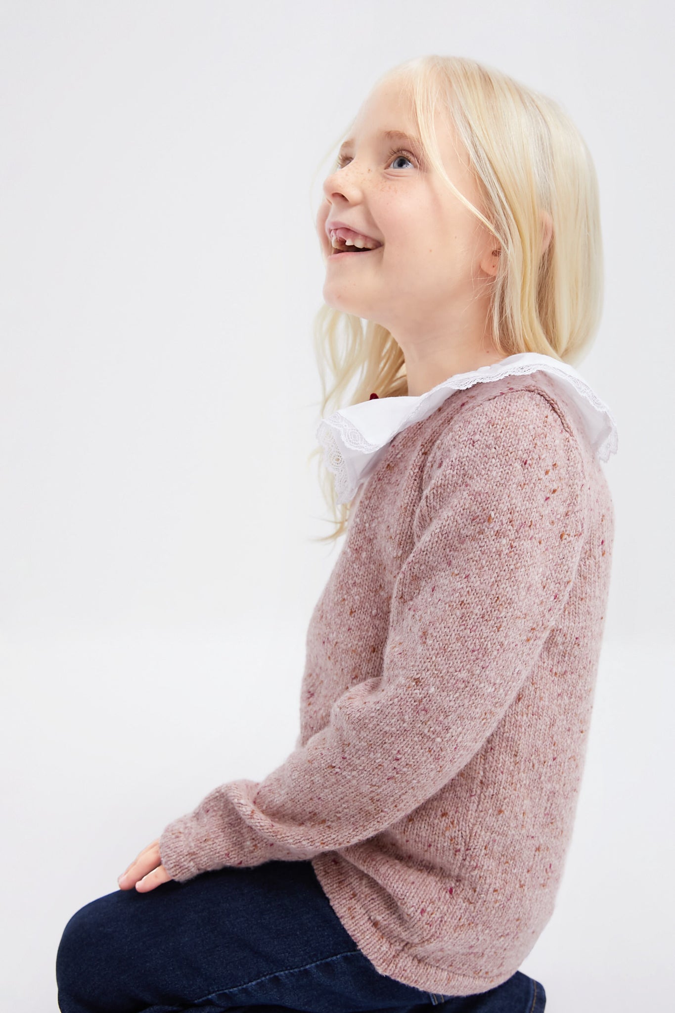 Crafted from a softest merino-wool blend. and decorated with an oversized collar with french lace and cute velvet bow. this Isla Jumper has a relaxed. boxy shape. with dropped shoulders and knitted long sleeves that drape perfectly on the arms. Rendered in a dreamy shade of dusty pink. it is perfect for family get-togethers and after school activities.