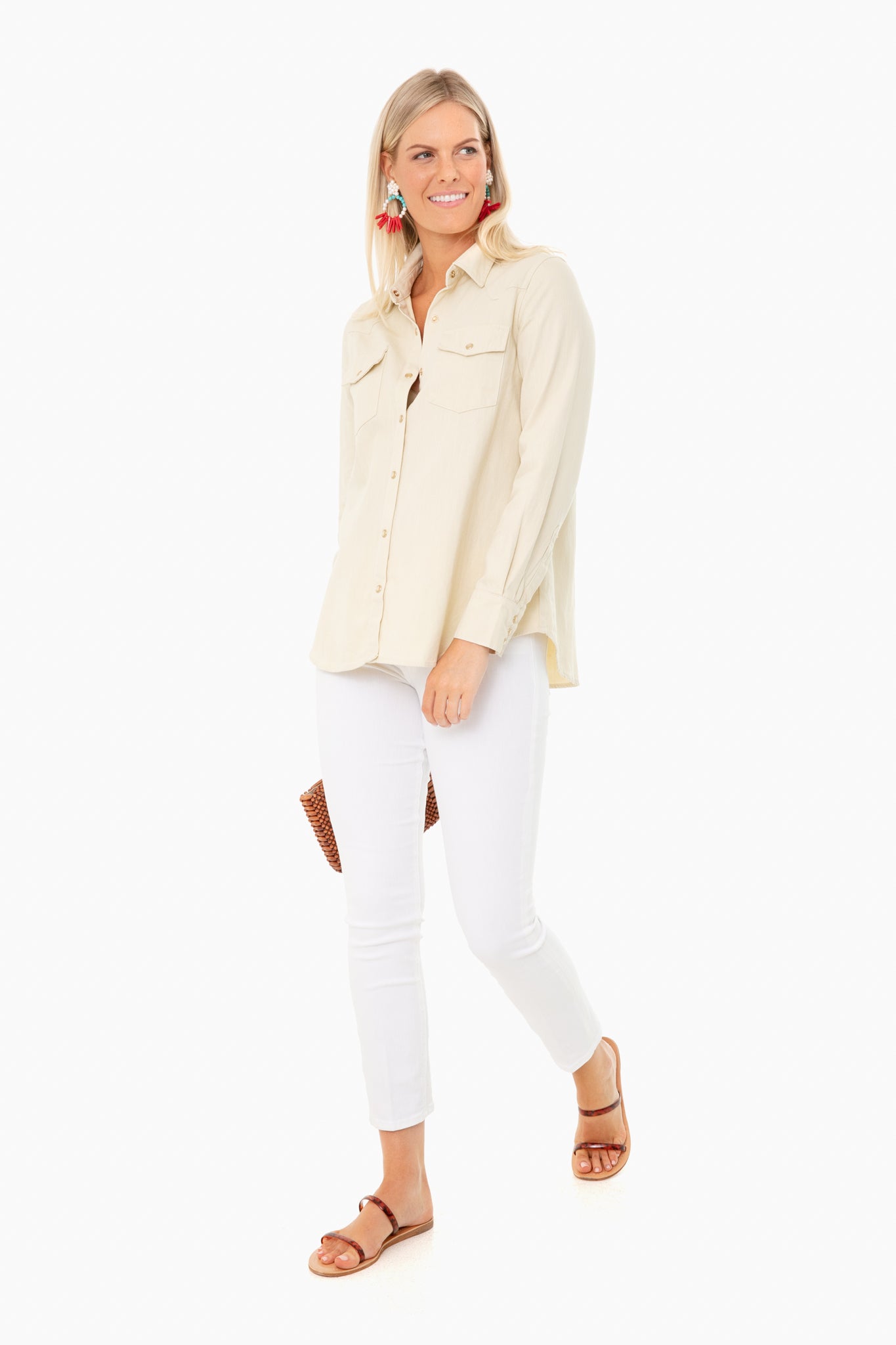 The Ivory Denim Steele Shirt is a menswear-inspired button-down. With a flattering high-low hem. this will elevate everything from a dress to boyfriend jeans. Ideal for virtual happy hour or a picnic with friends. throw this on and instantly look put-together.