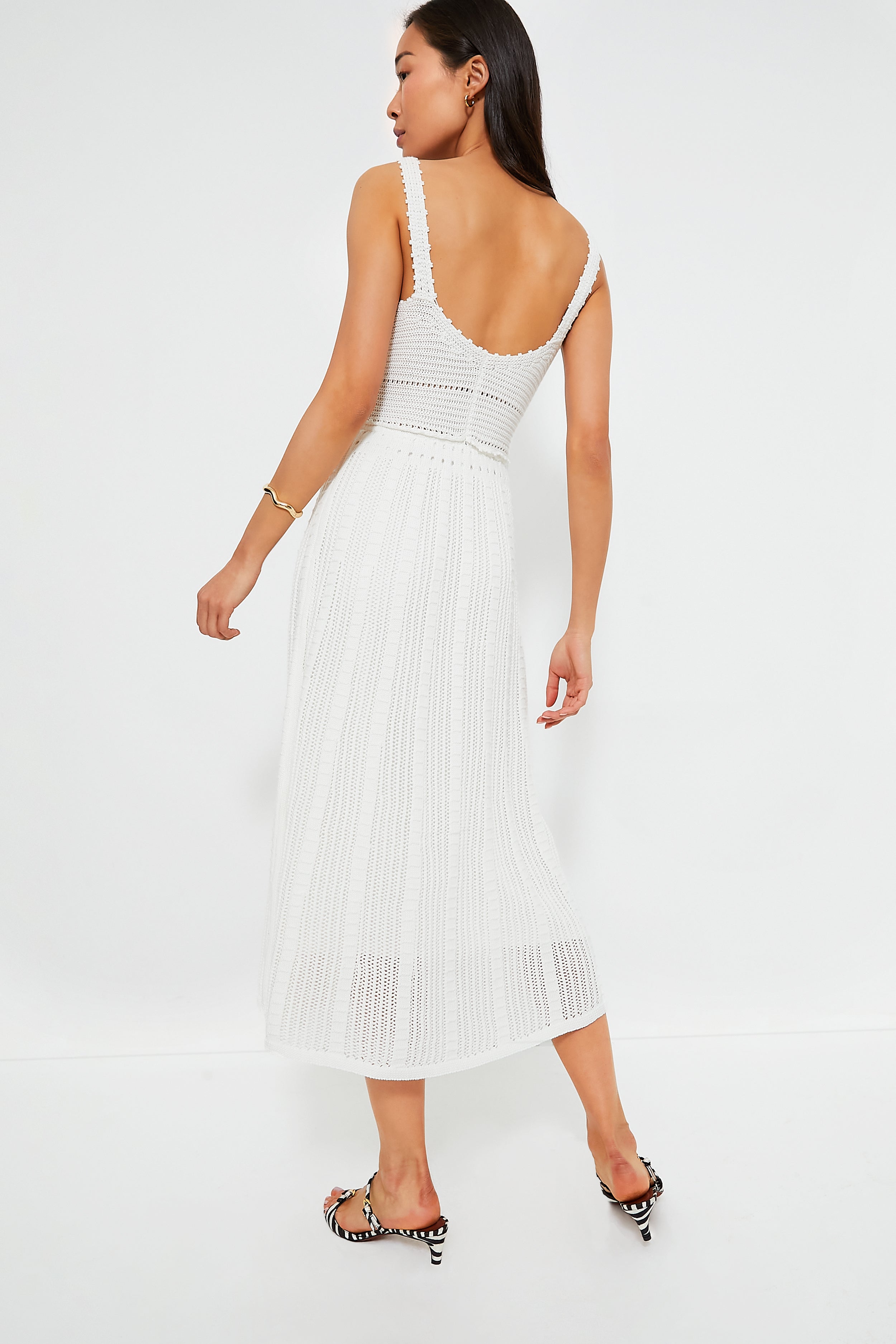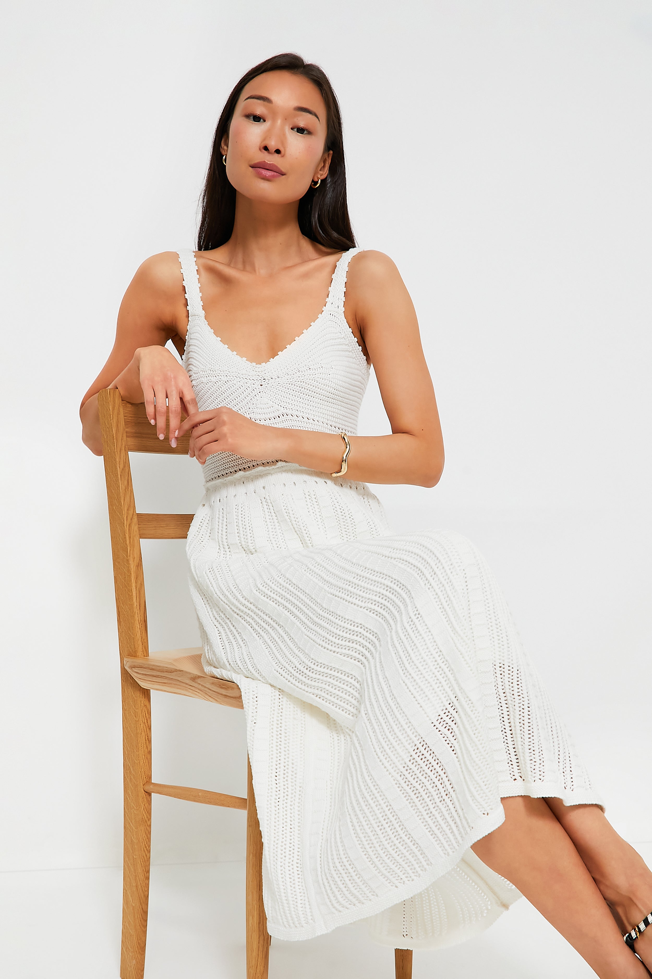 An adorable style for the warm-weather months. we are loving the Ivory Knit Midi Dress for its homegrown feel and flattering silhouette. This dress features a V-neckline. thin shoulder straps. and a fitted bodice that flows into an A-line skirt. Comfortable and easy. we are pairing this with sandals and gold jewelry for a look that can take you from the farmers market to the breweries with ease.