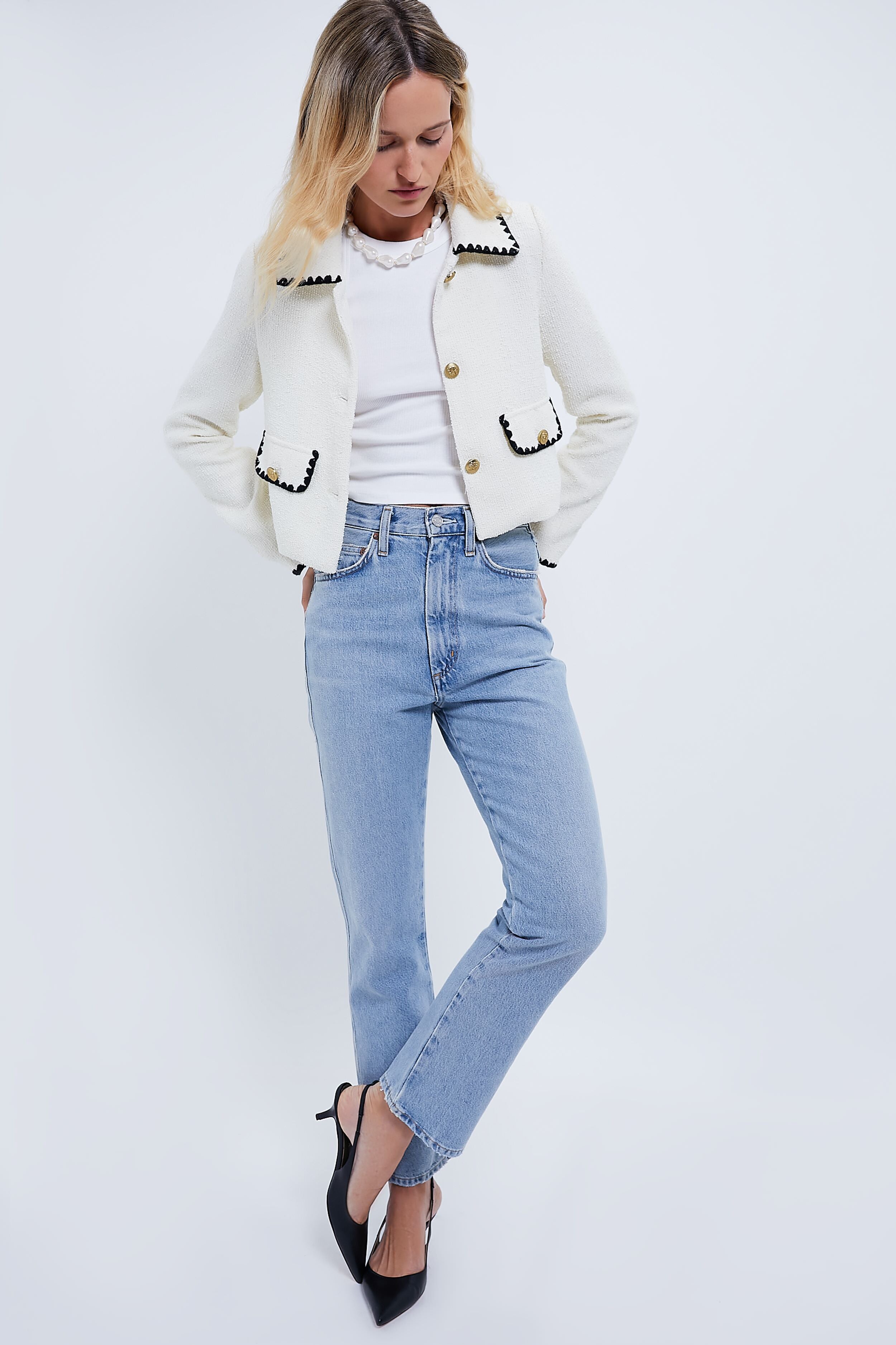 Lovely and ladylike. the Ivory Jacket is effortlessly elegant. A luxe neutral colorway combined with contrast stitch details. this slightly cropped blazer is perfect for wearing anywhere for a chic boost. Pair with denim and flats for a polished yet casual look. or throw it on over a dress for a feminine moment.