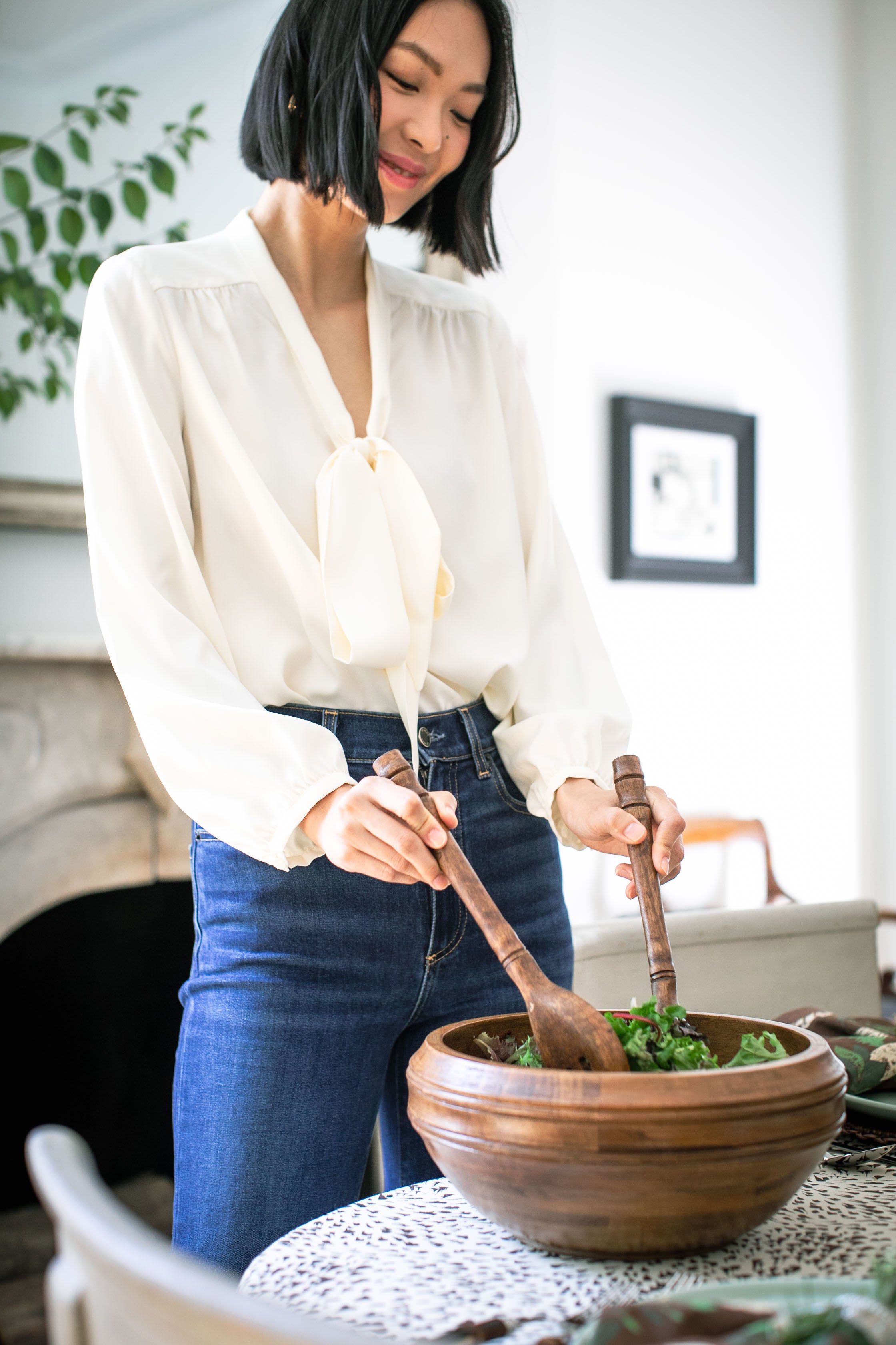 One of our favorite styles for the season. the Ivory Satin Eva Blouse is the epitome of unfussy femininity. Subtle details go a long way on this neutral yet notable style — its deep V-neckline. gathered shoulders. and sweet bow tie give it an extra special touch you're sure to love. Pair it with flared denim and platform heels for a retro-inspired look. dress it up by layering a blazer on top for your next big meeting. or style with denim and statement earrings for date night!
