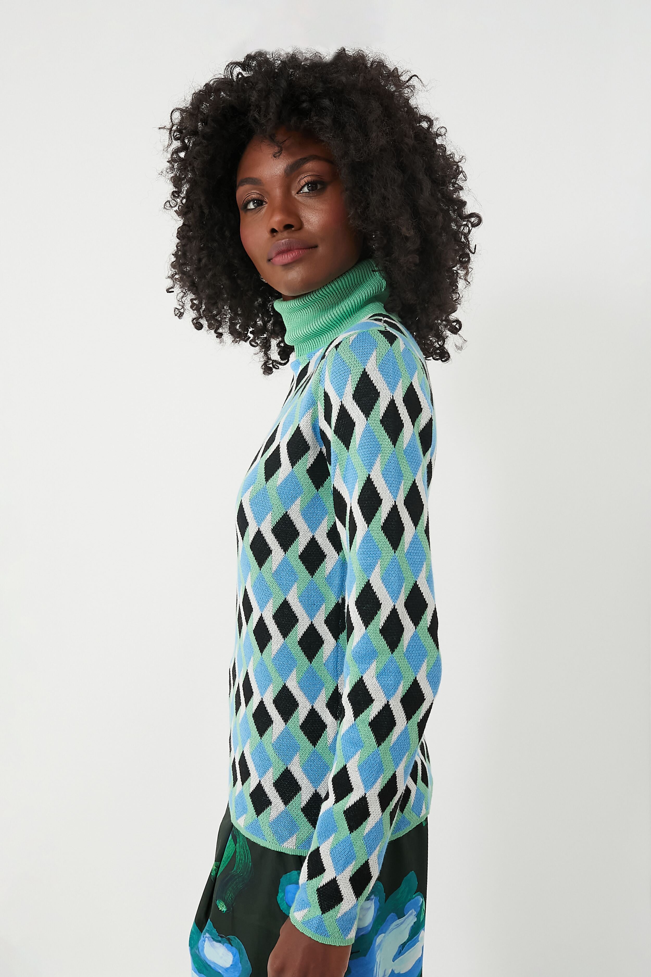 Full of fun and color. the Jacquard Rombos Terra Sweater is the geometric-printed number of our dreams. A classic slim-fitting turtleneck silhouette that will live in your closet for many seasons to come. this is the perfect style to tuck into denim. trousers. and skirts of all lengths from mini to maxi. There is nothing stopping you. so go full maximalist if you want and pair with mixed prints and bold colors. or keep it subtle with neutrals — either way you can't go wrong with this cool knit.