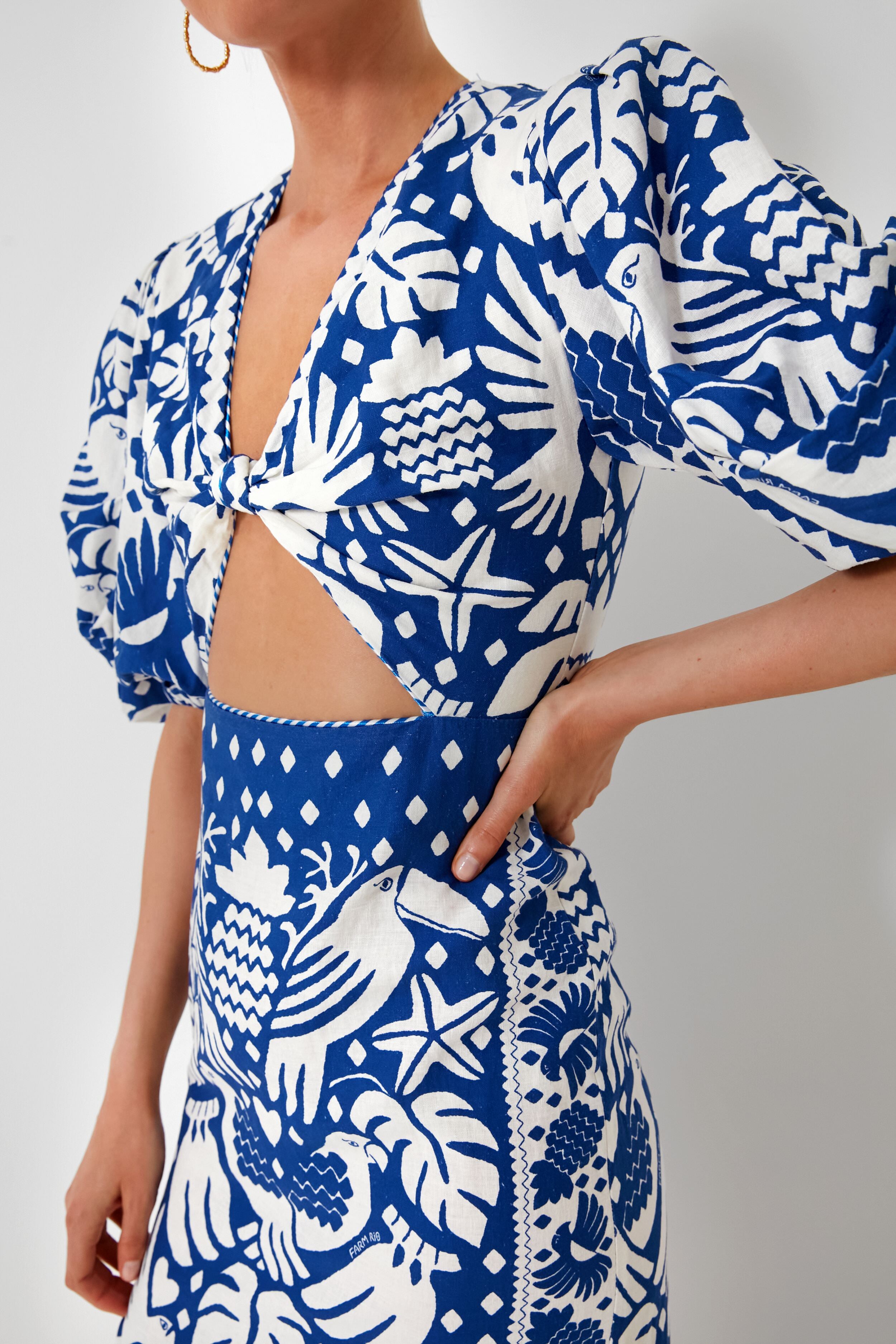 Dramatic puff sleeves frame the boldly patterned Jungle Scarf Navy Dress to create something incredible. In stunning shades of cobalt blue and bright white. this midi is all kinds of eye-catching and jaw-dropping — like. come on. look at that deep V-neckline and knotted bodice with a sleek cutout! Complete with side slits at the hem to promote easy movement so you can dance around in it (and we know you'll want to!). this is the perfect event-ready silhouette when paired with heels and a clutch.